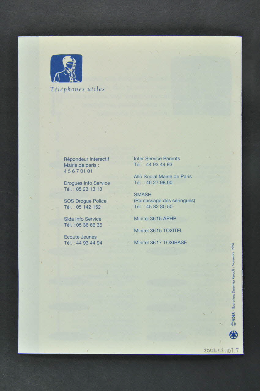 Téléphones utiles // // Répondeur Intéractif // Mairie de Paris // 4 5 6 7 01 01 // // [...] (Au centre, en bleu), versoAuteur, date