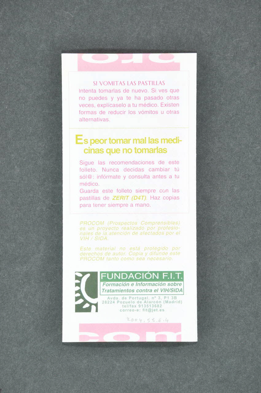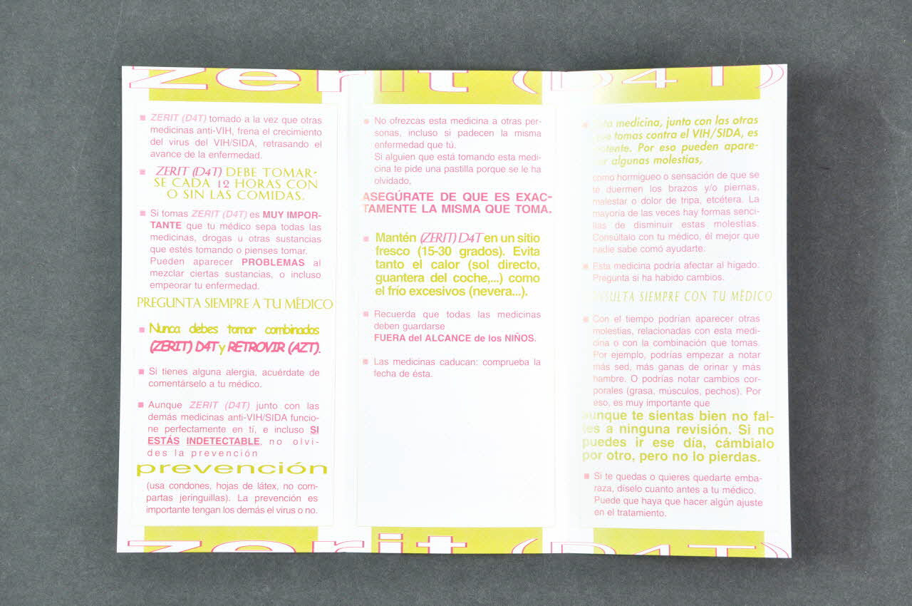 PREGUNTA SIEMPRE A TU MEDICO // // Nunca debes tmar combinados // ZERIT (D4T) y RETROVIR (AZT) // // no olvides la // prevención // // Mantén ZERIT (D4T) // en un sitio fresco (15-30 // grados). Evita tanto el calor // (sol directo, guantera del // coche,...) como el frio exce- // sivos (nevera,...) // // FUERA del ALCANCE de los NIÑOS. // // Esta medicina, junto con las otras // que tomas contra el VIH/SIDA, // es potente. Por eso pueden apa- // recer algunas molestias, // // CONSULTA SIEMPRE CON TU MEDICO // // aunque te sientas bien no faltes a nin- // guna revisión. Si no puedes ir ese dia, // cambialo por otro, pero no lo pierdas. // // SI TE OLVIDA LA TOMA // // SI INTERRUMPES EL TRATAMIENTO // ANTI-SIDA // // SI VOMITAS LAS PASTILLAS // // Es peor tomar mal las medi- // cinas que no tomarlas (Au recto et au verso)Décor