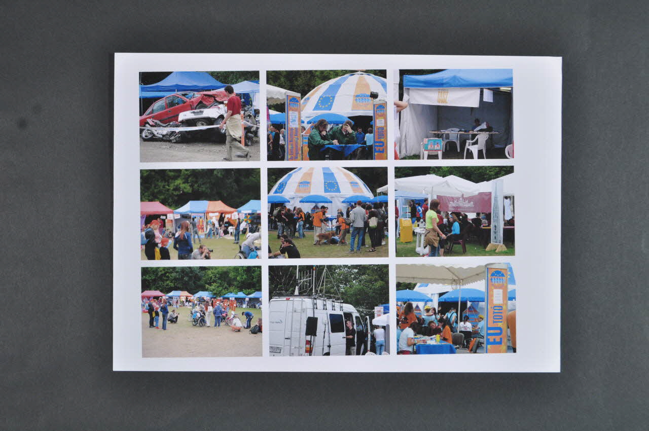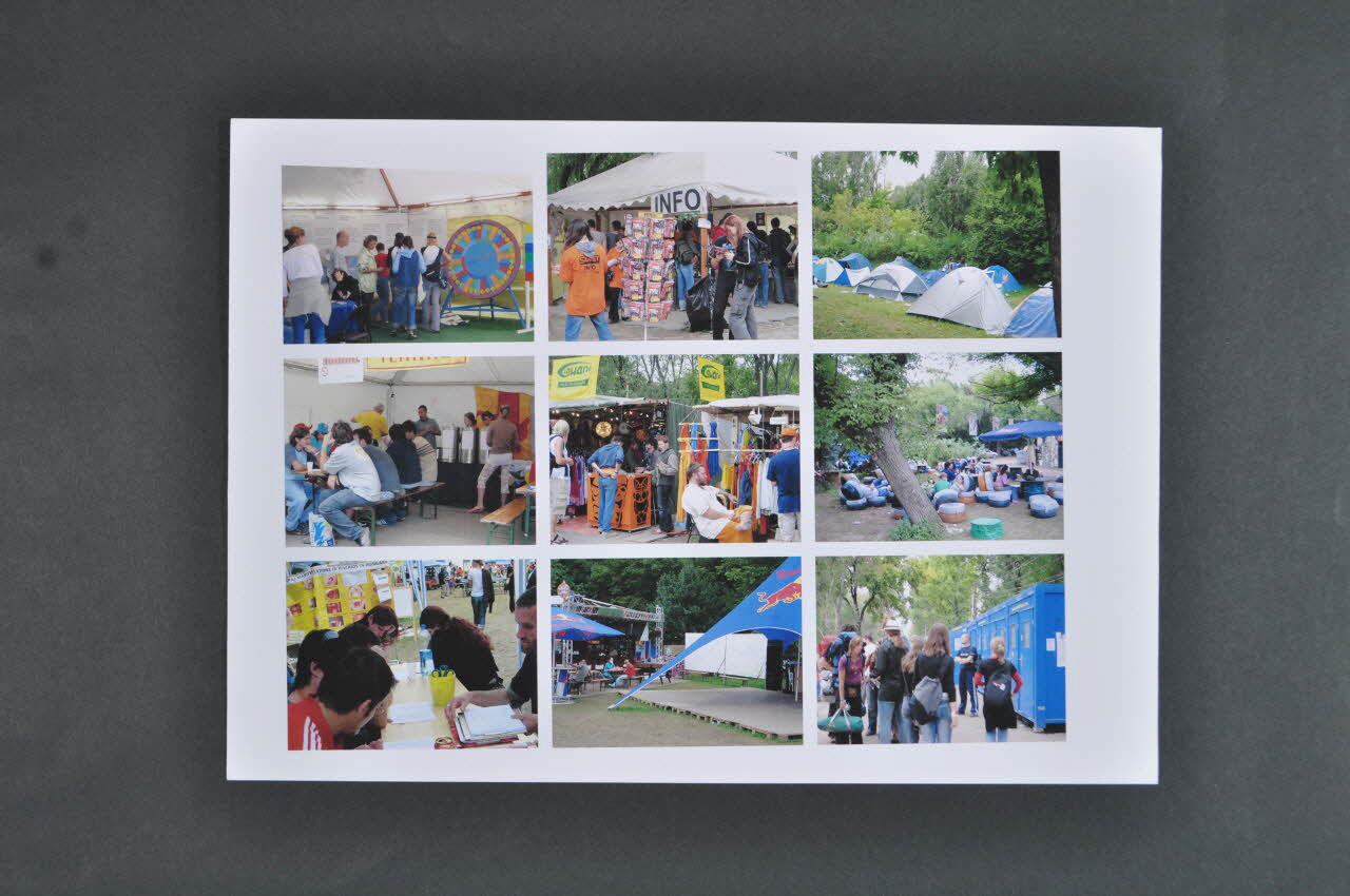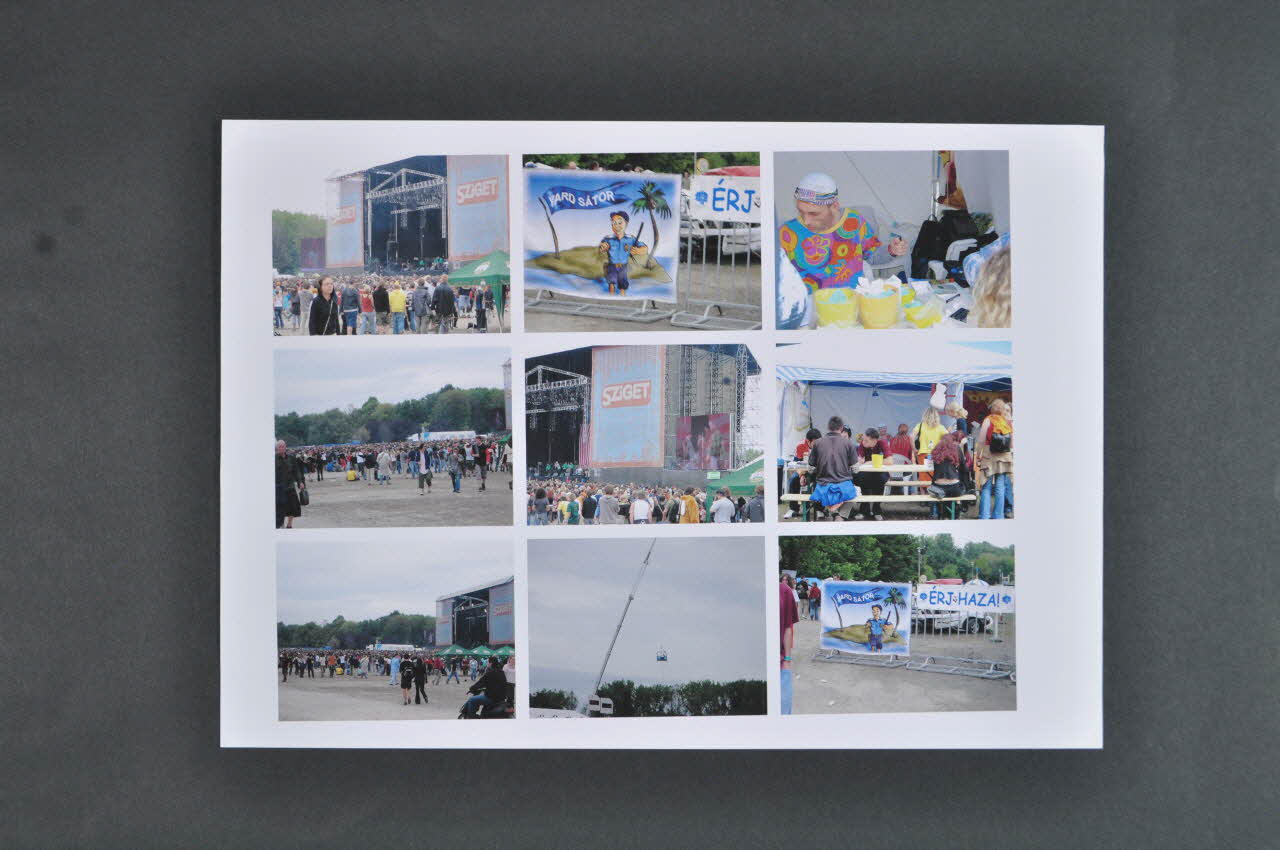 Les photos sont des vues du festival : le podium avec "Sziget" en grand, la foule, les buvettes, les tentes, les stands de vêtements, le village associatif.