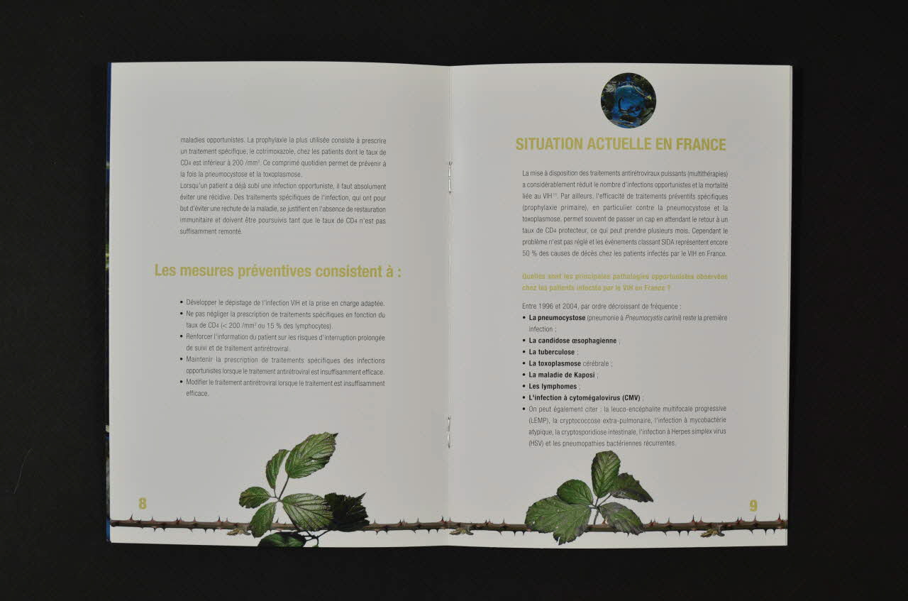 Double en 2008.32.197 / sommaire commenté par F.Loux : - p.2 (Verso de la couverture). Même photo du scorpion, agrandie et sans inscription. - Les autres pages : fond blanc, impression en noir. En haut, dans un petit cercle, la photo du scorpion. En bas, horizontalement, photo d'une branche avec feuilles et épines. Sommaire - Qu'est-ce qu'une infection opportuniste ? - Pourquoi surviennent-elles ? - Exemple de la toxoplasmose - Qui est concerné par les infections opportunistes ? - Peut-on prévenir les infections opportunistes ? - Situation actuelle en France : par ordre décroissant de fréquence : la pneumocystose, la candidose oesophagienne, la tuberculose, la toxoplasmose cérébrale, la maladie de kaposi, les lymphomes, l'infection à cytomégalovirus - Les infections opportunistes sont-elles contagieuses ? Peut-on les traiter ? - La tuberculose associée au VIH - Les tumeurs - Conclusion (nécessité d'un dépistage précoce) - Bibliographie