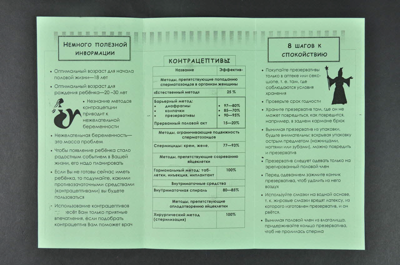 La couverture comporte des inscriptions en gras au centre, et un dessin de hibou lisant un livre en bas. L'intérieur contient des textes illustrés de dessins (sirène à gauche, magicien à droite), avec un tableau chiffré en page centrale. Le verso du troisième volet comporte un texte illustré : symboles masculin et féminin, préservatif dans son emballage. A l'arrière figurent deux logos (oeil stylisé, femme et enfant dans un globe entouré de lauriers) et des coordonnées.Inscriptions