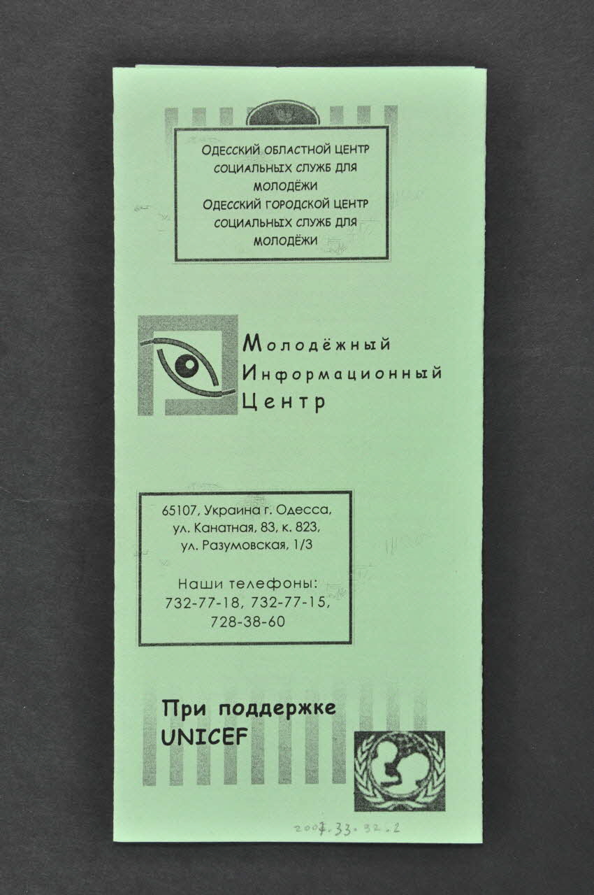 Ce dépliant en ukrainien est imprimé sur une feuille de papier verte pliée en trois volets.