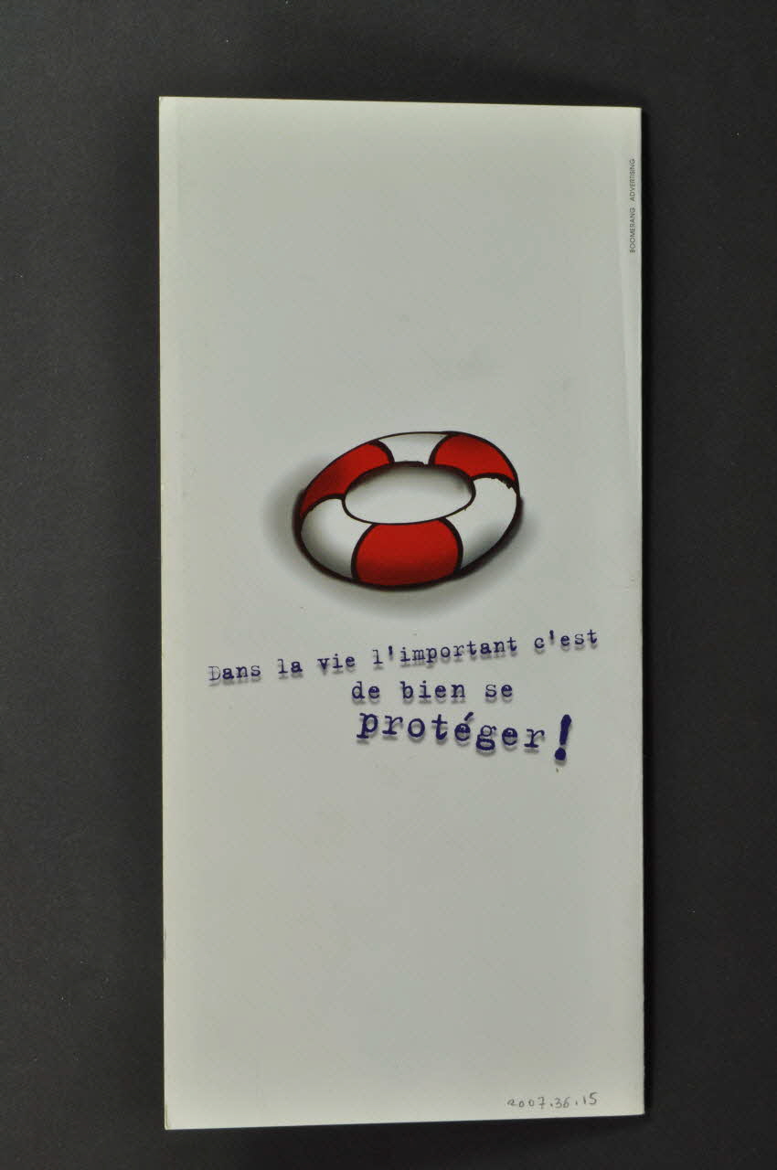 Embarquons tous ensemble // pour une année pleine // de vie. // // Dans la vie l'important c'est // de bien se // protéger ! (Première inscription placée sous le dessin au recto, la deuxième sous le dessin au verso.)Décor