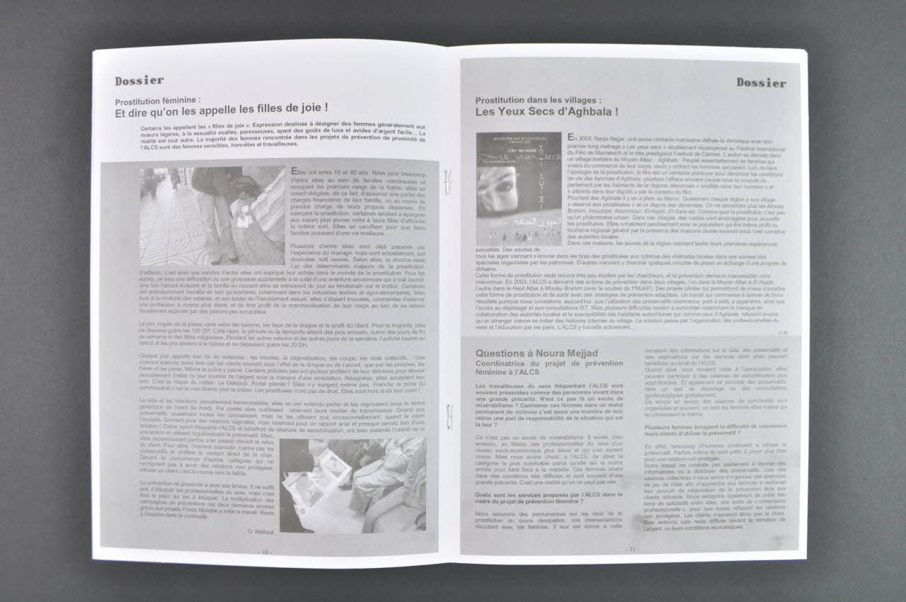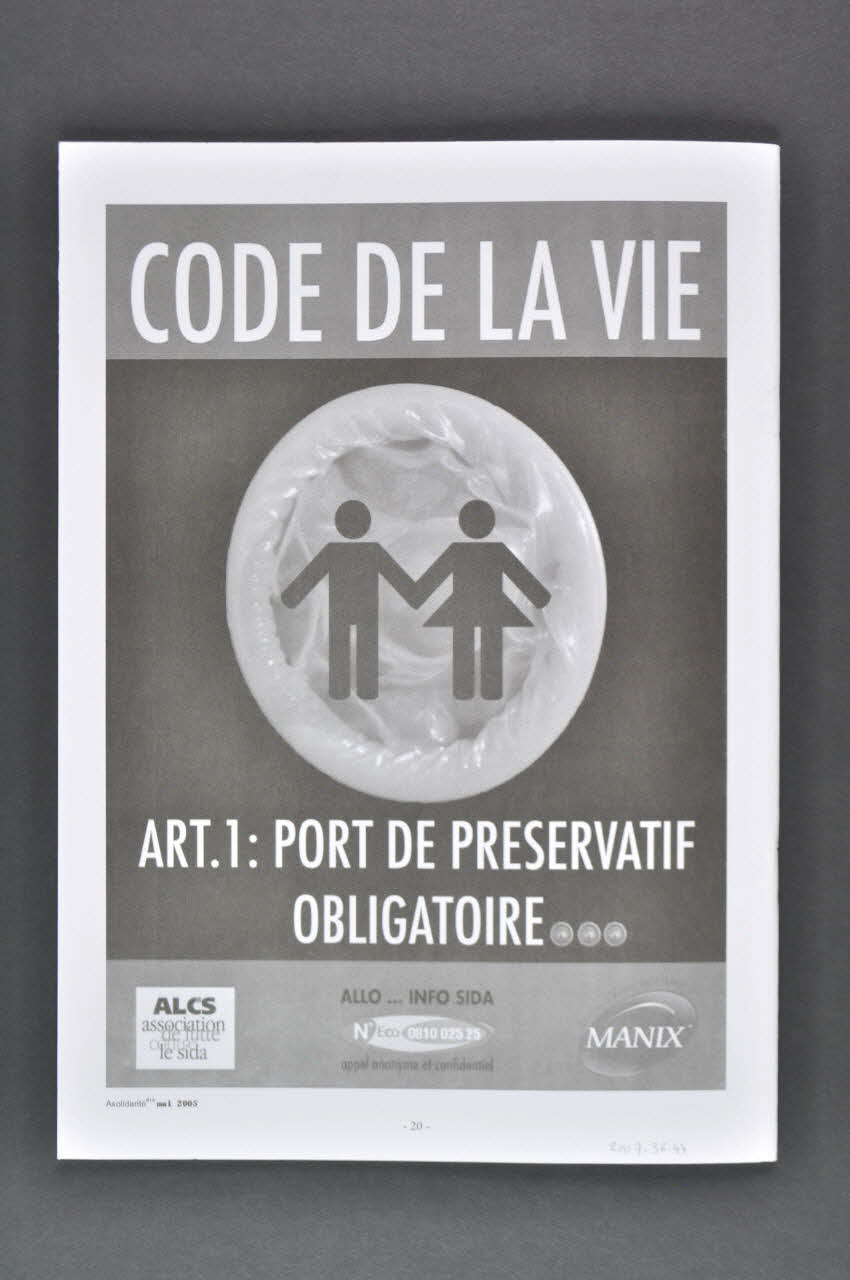 Dos. Reproduction en noir et blanc de l'affiche : "Code de la vie. Art 1 Port de préservatif obligatoire " (2007.38.02) Précisions sur le contenu : - p.2 (en blanc sur fond noir) : Sommaire / (en noir sur fond blanc) : édito : "Visite royale" (visite du roi à l'hôpital, soulignant l'intérêt que le roi porte à la "cause du sida". - p.3 "Actualités" : "Visite Royale à l'Hôpital de jour" / "Lancement de la 4ème et dernière phase de la campagne nationale contre le sida" (sur le dépistage) - p.4 "International" : "L'Inde a voté le changement de sa loi sur les brevets" / "Un an après, le Canada n"a toujours pas appliqué la loi sur les ARV génériques" / "Le Brésil refuse l'aide conditionnée des Etats-Unis" - p.5 "Recherche" : "Bébés séropositifs : anti-rétrovirus plus efficaces les deux premiers mois" / "Des orphelins américains cobayes pour le sida !" / "Le bacille qui croque du VIH" - p.6 (sur fond gris). "Interview" : "Othman Mallouk "Propriété intellectuelle et accès aux médicaments. La dernière chance." - p.7-8 "Evènement" : "VIèmes Assises Nationales de l'ALCS" (thème : "Sida, santé et droits de l'homme" / (en blanc sur bandeau gris) : "Après l'accès aux traitements, l'accès aux Droits !" / (en blanc sur bandeau noir) : "Pourquoi le Vih/sida, les droits de la personne et la santé publique sont indissociables ? Des années d'expérience dans la lutte contre l'épidémie de VIH/sida ont confirmé que la promotion et la protection des droits de l'homme représentent une composante essentielle de la prévention de la transmission du VIH et de la diminution des incidences du VIH/sida. La protection et la promotion des droits de l'Homme sont nécessaires tant pour protéger la dignité naturelle des personnes touchées par le VIH/sida que pour atteindre les buts de santé publique que sont la diminution de la vulnérabilité à l'infection au VIH, l'atténuation des conséquences négatives du VIH/Sida sur les personnes touchées et l'incitation à la lutte que peuvent mener les individus et les communautés contre le VIH/sida" - p.9-12 "Dossier" (en noir sur fond gris) : "Profession : travailleuse du sexe" / "Prostitution féminine : Et dire qu'on les appelle les filles de joie" ("La réalité est toute autre. La majorité des femmes rencontrées dans les projets de prévention de proximité de l'ALCS sont des femmes sensibles, honnêtes et travailleuses.") / "Prostitution dans les villages" (le film les yeux secs d'Aghbala) / "Questions à Noura Mejjad coordinatrice du projet de prévention féminine à l'ALCS" / "Bousbir : quand la prostitution était légale au Maroc" - p.13 BD en arabe : conseils de prévention - p.14 "Prise en charge" : "Comprendre l'organisation de la prise en charge afin de mieux orienter." - p.15 "Décentralisation" : "Centre référent ou pôle d'excellence ? Marrakech hésite" - p.16-18 "Prévention" : "Intérêt du dépistage précoce de l'infection à VIH" / "Laayoune : L'ALCS à la conquête du Grand Sud Marocain." / "Méknès : Touche pas à ma vie. Non au sida !" (campagne et course des jeunes) / "Tiznit : Large campagne de prévention et de dépistage" / "Marrakech : l'ALCS et Manix investissent le milieu festif" (campagne d'affiches : "qui a dit que tradition ne rimait pas avec prévention" et "code de la vie" - p.19 "ALCS News"