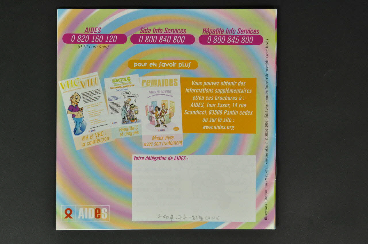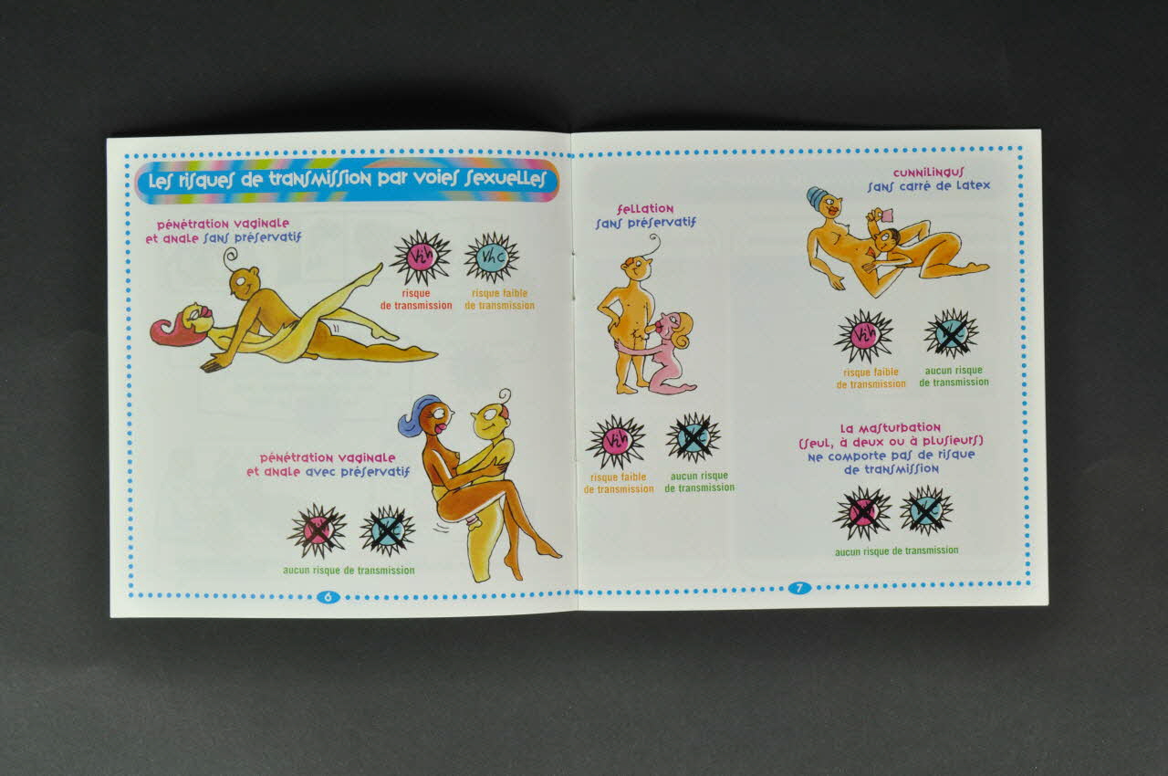 De forme carrée, la brochure en papier est composée de huit feuillets. Sur la couverture, le fond est couvert de cercles bleus, verts, roses, violets et orange à peu près concentriques. En surimpression figurent des inscriptions violettes et tout autour six dessins représentant les têtes de personnages. Dans le coin inférieur gauche se trouve le logo de AIDES. On retrouve le même fond sur le verso mais en plus pâle. Y sont imprimées des inscriptions violettes, blanches sur violet et blanches sur orange et trois couvertures de brochures. A l'intérieur, les pages, blanches, sont entourées d'une ligne de points bleus. Les textes bleus, orange, verts, roses, violets, rouges et blancs sont accompagnés de nombreux dessins colorés.Inscriptions