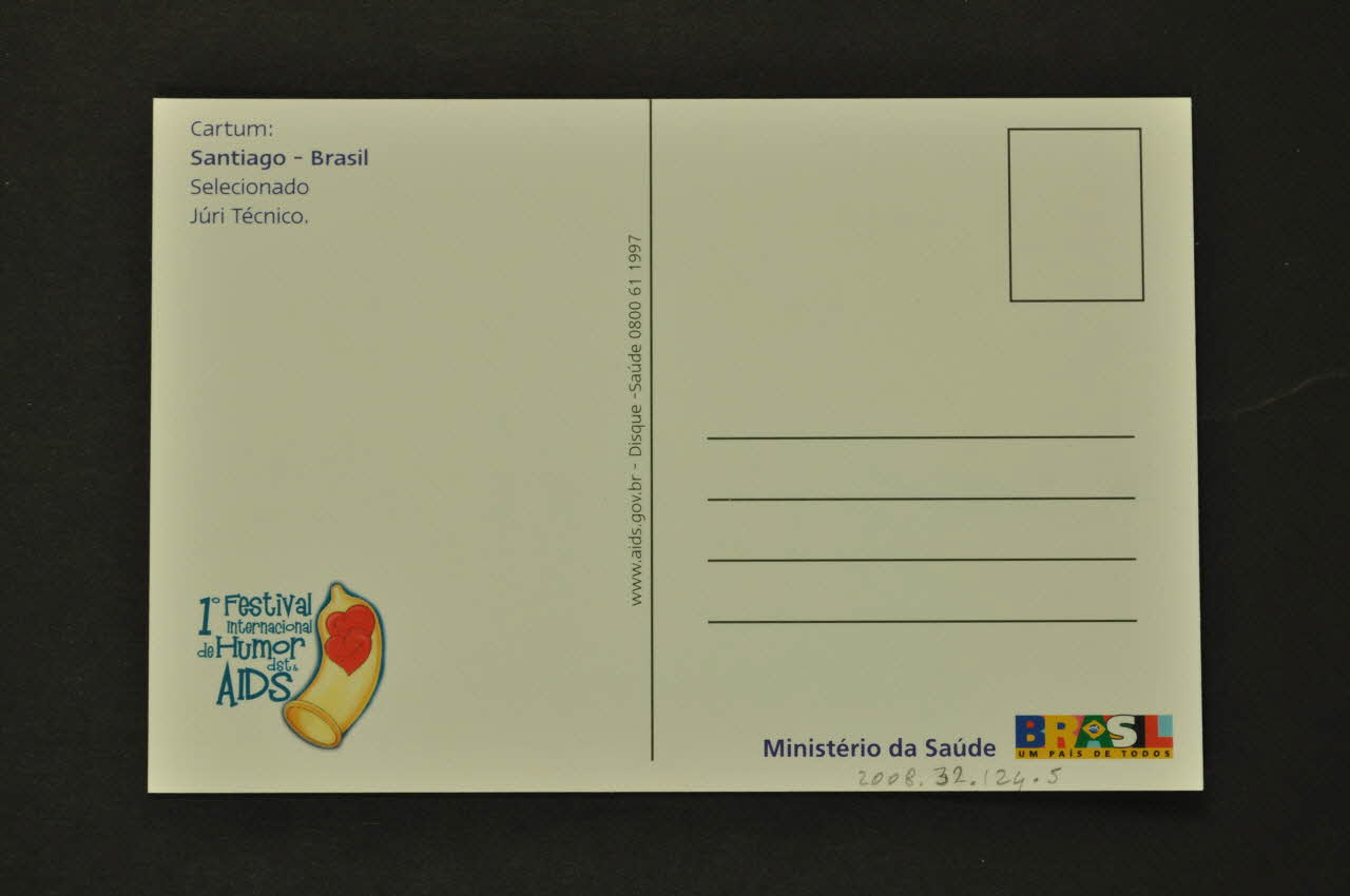 Ministério da Saúde BRASIL UM PAIS DE TODOS (en bas à droite), verso1° Festival // internacional // de Humor // dst & // AIDS (en bas à gauche, avec un dessin de deux coeurs dans un préservatif.), versoAdresse, date