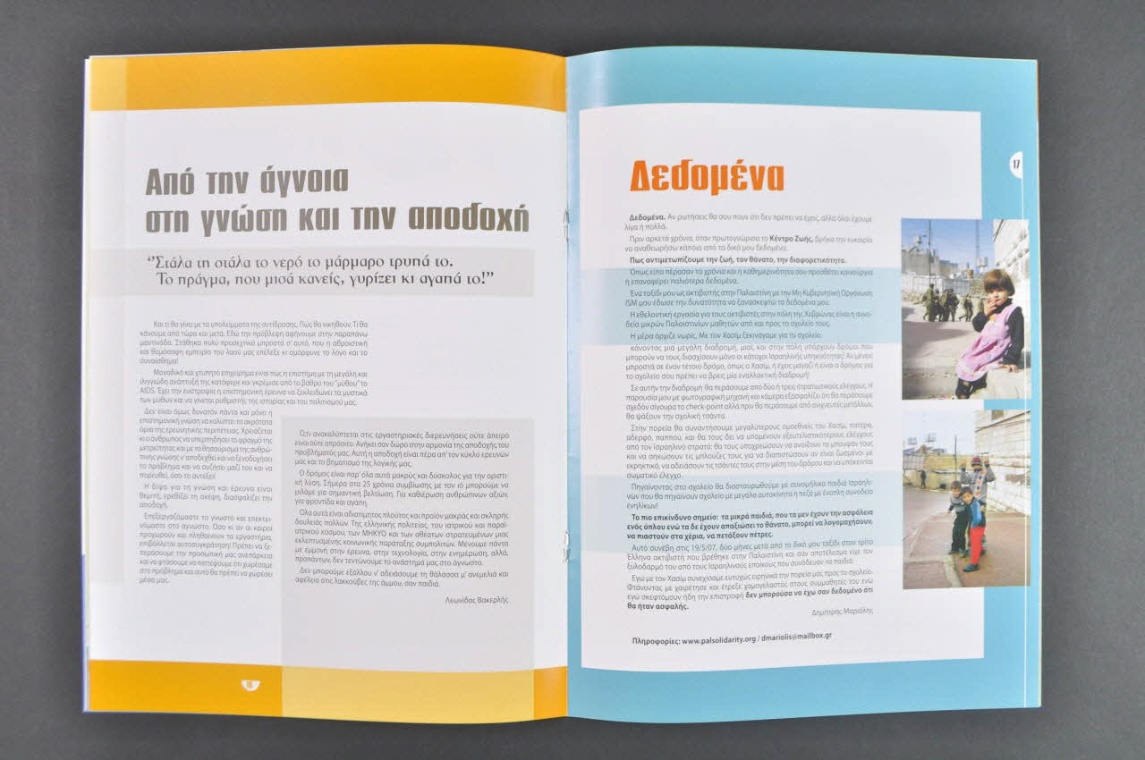 Cette revue en grec est constituée de trente pages de papier glacé imprimées et reliées entre elles par deux agrafes métalliques.