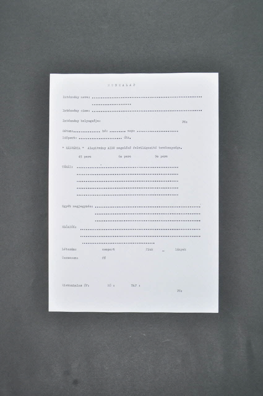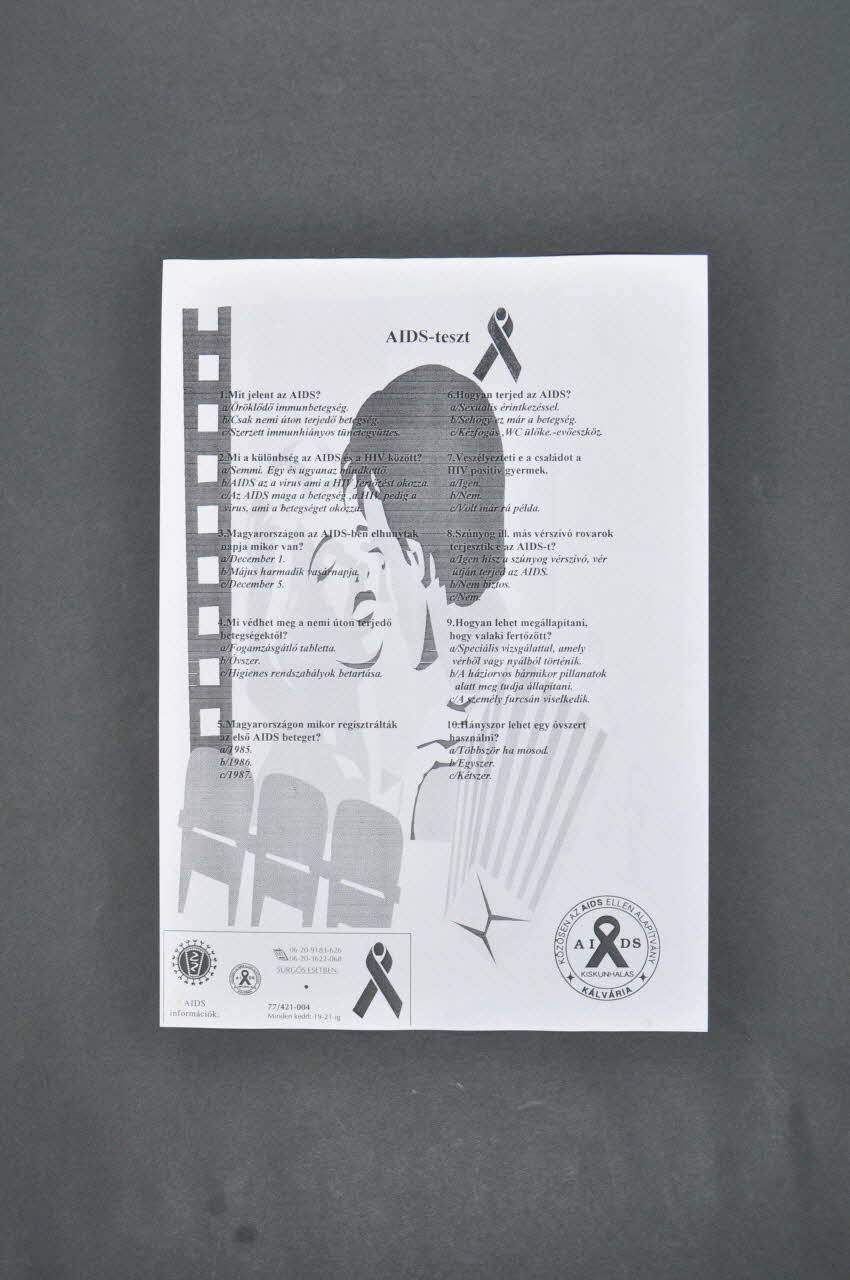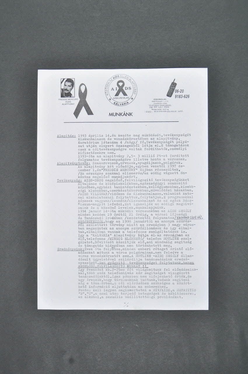 .1 : Feuille à remplir par les écoutants de la ligne téléphonique, les deux fiches sont identiques et attachées ensemble par une agraphe, elles sont imprimées recto verso. Au dos se trouve le logo de l'association. .2 : Feuille à remplir pour un test de dépistage, les deux fiches sont identiques et attachées ensemble par une agraphe, elles sont imprimées recto verso. Au dos se trouve le logo de l'association. .3 : Feuille à remplir, seul le recto est photocopié. .4 : Feuille et tableau à remplir, seul le recto est photocopié. En bas on peut voir le logo de l'association. .5 : Quizz en 10 questions, pour chacune il y a trois choix de réponses. En sous impression se trouve un dessin d'un jeune garçon et jeune fille s'embrassant, seul le recto est photocopié. En bas on peut voir le logo de l'association. .6 : Carte de Budapest, des secteurs de prévention, seul le recto est photocopié. .7 : Lettre signée par un docteur, seul le recto est photocopié. .8 : Lettre signée par un docteur, seul le recto est photocopié. .9 : Petite feuille blanche découpée, seul le recto est photocopié. .10 : Feuille blanche imprimée recto-verso avec la photo de Freddie Mercury en haut à gauche ainsi que le logo de l'association, elle est signée. A côté de la signature se trouve un tampon du logo de l'association.Inscriptions