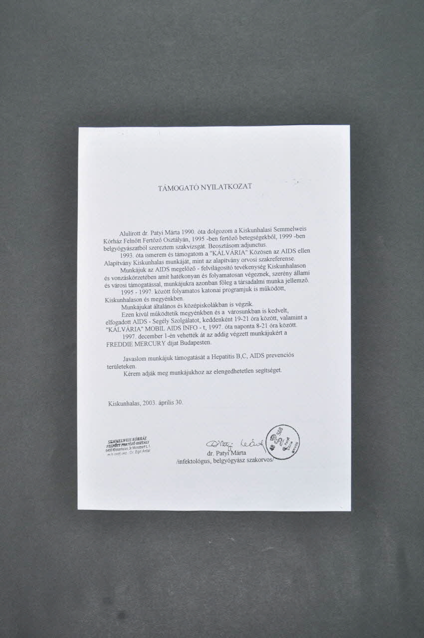 TAMOGATO NYILATKOZAT // [...] // Kiskunhalas, 2003. április 30. // dr. Patyi Márta // /infectológus, belyógyász szakorvos/ (.7), rectoLogo, nom d'association