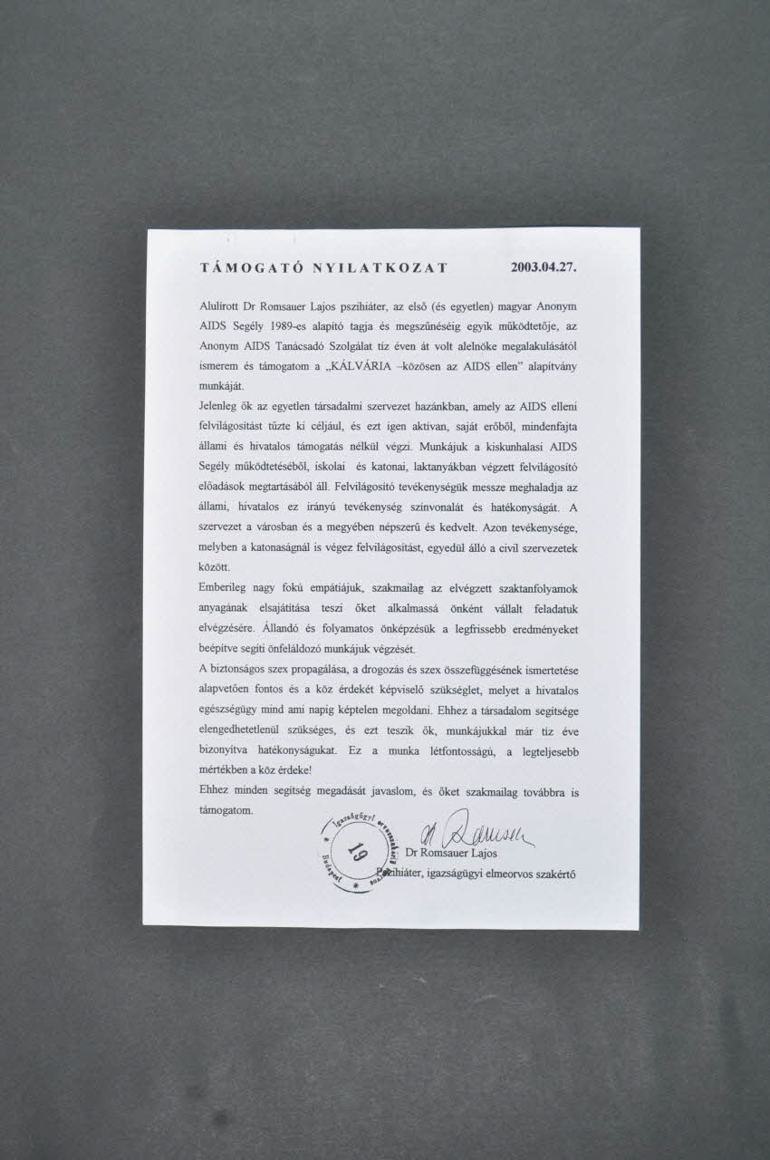 TAMOGATO NYILATKOZAT 2003.04.27 // [...] // Dr Romsauer Lajos // Pzsihiáter, igazságügyi elmorvos szakértö (.8), rectoAuteur, titre, concernant la date, concernant le lieu d'exécution, signature
