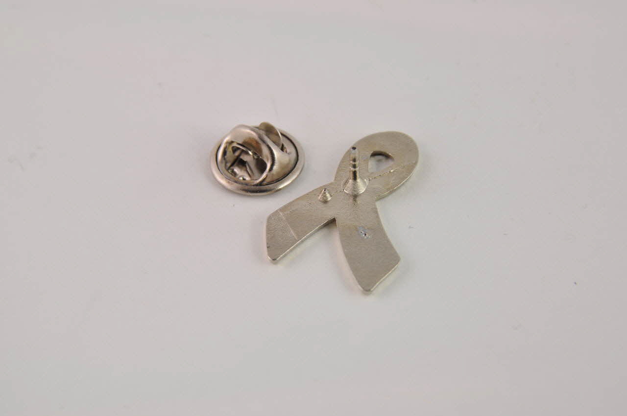 Métal moulé émaillé. / Pin's en métal argenté, prenant la forme d'un grand ruban rouge entouré d'un liseré argenté.Décor