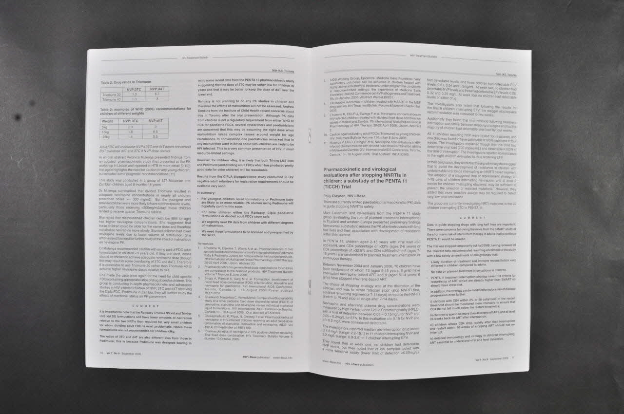 EDITORIAL 2 // CONFERENCE REPORTS/ XVI International AIDS Conference, Toronto, Canada, 13-18 August 2006 3 // [...] // TREATMENT ACCESS 23 // [...] // WHO GUIDELINES 24 // [...] // ANTIRETROVIRALS 25 // [...] // ON THE WEB 26 // FUTURE MEETINGS 27 // PUBLICATIONS & SERVICES FORM i-BASE 28 // DONATION FORM 31 // FAX-BACK ORDER FORM 32 (Sous le bandeau mauve), sur la couvertureDate