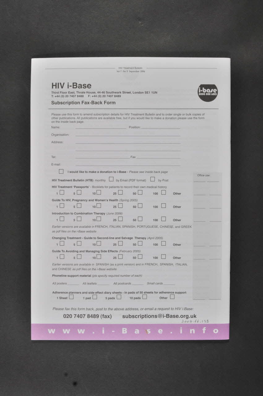 Published by HIV i-Base (En bas, sur le bandeau mauve), sur la couvertureDécor