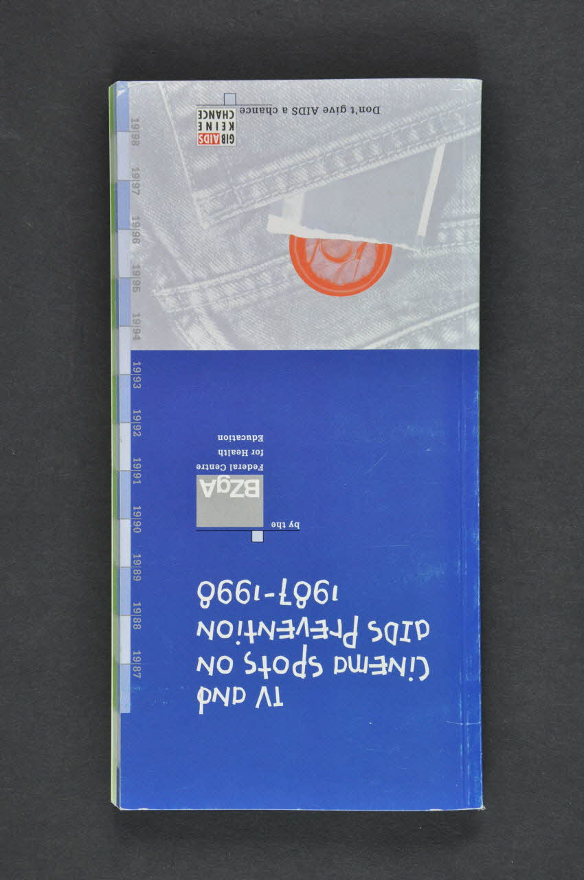 Brochure bilingue français anglais : "TV et cinéma spots au prévention du sida 1987-1998" / Brochure bilingue français anglais, présentation tête bêche. Côté 1. Couverture fond vert en haut aux deux tiers avec en caractères fantaisie noirs : "TV et cinéma spots au prévention du sida 1987-1998". En dessous, petit rectangle gris avec en blanc "BZgA" et en dessous, en petits caractères noirs :"Centre Fédéral d'Education pour la Santé". En bas, sur le tiers restant, en gris vert, poche de jean d'où sort une enveloppe de préservatif à demi ouverte sur un préservatif rond rouge. Tout en bas, le logo et le slogan de la campagne : "Gib AIDS Keine Chance" / Aucune chance au sida. A droite, verticalement, petits onglets vert clair et blanc avec en gris dates de 1987 et 1998. Côté 2. Couverture inversée par rapport au côté 1. Même chose, sauf en langue anglaise et en couleurs différentes : les deux tiers du haut sont en blanc sur fond noir et les onglets sont bleu clair et blancs. Intérieur fond blanc, avec ombres vertes côté 1 et bleues côté 2, impression en noir. Présentation uniforme des spots. Titre en français ou anglais en caractères fantaisie noirs, en dessous titre en allemand sur bandeau vert ou bleu. A droite, date sur fond blanc encadré de bleu ou vert. En dessous, sur une ou deux pages texte ou description du spot. En dessous, petites photos couleur tirées du film. En bas, logo et slogan de la campagne. Mêmes onglets à chaque page.