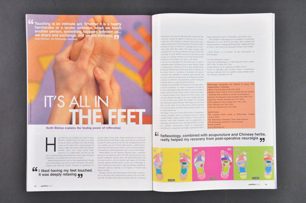 Les articles sont regroupés sur le sommaire en 3 rubriques : features (portraits) / treatments / regulars. Features : - p. 14 Films sur le VIH au festival de films bi, gay et lesbiens (titre de couverture) - p. 16 Le printemps est là. Besoin de prévention (grand titre de couverture) - p. 18 10 ans de Gay men fighting AIDS (titre de couverture) (histoire de l'association, campagne sur le bareback) - p. 22 Echange de seringues chez Mainliner ( travail sur le terrain), reportage sur le travail de l'association. - p. 26 Les sudaméricains gays séropositifs à Londres - p. 28 Emotions à la 6ème conférence de CHAPS, sur la communauté gay - p. 32 Le combat du Zimbabwe contre le sida Traitements - p. 35 Nouvelles des traitements (la neuvième conférence sur les rétrovirus, microbicides) - p. 36 La tuberculose associée au VIH - p. 40 La conférence sur l'hépatite C de Lisbonne - p. 42 Réflexologie Rubriques régulières Lettres de lecteurs Chouchoutez vous (jus de fruits, nourriture énergétique) - Témoignages p. 7 page éditée par Gay Men Fighting AIDS. Un personnage assis sur une chaise, peint en rose, ligoté. A droite, titre en blanc, puis rose et texte écrit en blanc en dessous (en anglais) : "Séropositif et vous sentant baisé...? Cela est arrivé à beaucoup d'entre nous, de se sentir baisé. Pourqoui ai-je été infecté alors que je connaissais toutes les règles ? C'est facile de vous donner à vous même des coups quand vous avez le VIH" En dessous, en rose : ... Foutez vous en ... et vous n'en avez pas besoin. Trouvez quelqu'un en qui vous pouvez avoir confiance, parlez lui, travaillez cela. Faites-le, bougez. Vous en valez la peine. Et, en bas, en rose, puis blanc : "Parlez à quelqu'un en qui vous avez confiance : un ami, votre médecin, votre famille. Et en dessous, les coordonnées de Gay men Fighting AIDS. p. 29 faite par Terrence Higgins Trust. Fond vert, silhouette violette avec tête minuscule et grande main portant un "?" blanc. En grosses lettres bleues et blanches (en anglais) : Savez vous comment obtenir les réponses dont vous avez besoin? Et, en dessous, en petits caractères blancs : Les cliniques VIH, les médecins de famille, les services sociaux et même les familles et les amis peuvent tous vous aider à bien vivre avec le VIH. / Mais parfois, il peut être difficile de leur en parler ou de demander l'information dont vous avez besoin. Terrence Higgins trust peut vous aider à obtenir le meilleur des gens qui sont là pour vous aider." (en bas, numéro de la Hot Line.) Encarté à l'intérieur, questionnaire aux lecteurs sur la revue.