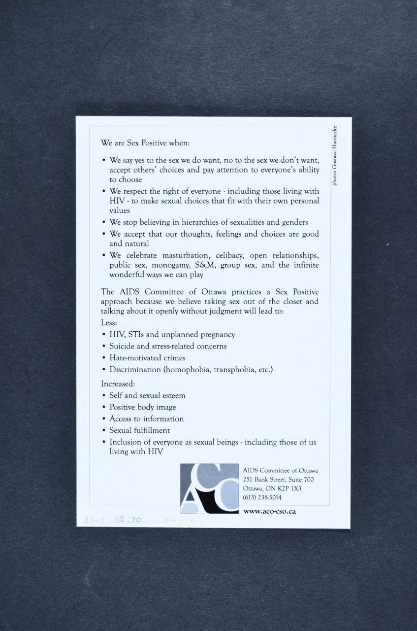 AIDS Committee of Ottawa // 251 Bank Street, Suite 700 // Ottawa, ON K2P 1X3 (du verso, vers la droite), en basDécor