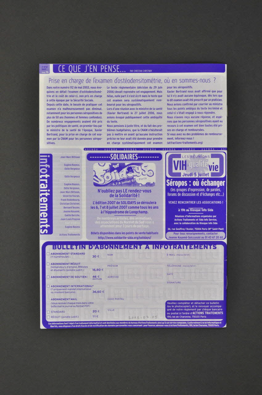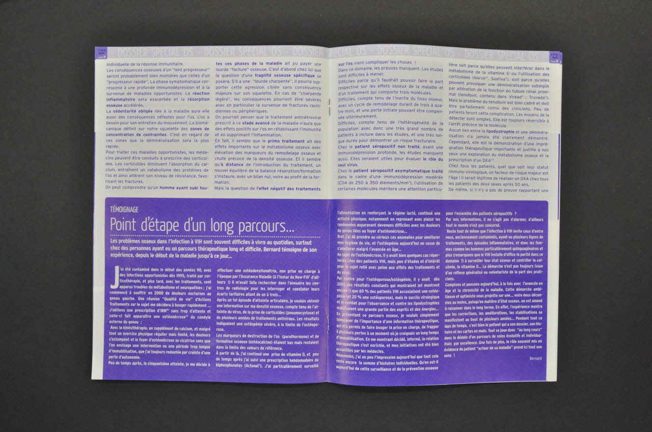page 2. Stratégies thérapeutiques: Anticiper l'avenir dès le présernt // page 6. Interview du Dr Jacques Bernard: L'os, un capital à préserver // pages 8. Témoignage: Point d'étape d'un long parcours // page 12. Séropositivité: Maladie ou handicap? // page 14. ALERTE à destination des patients traités par Viracept® // page 16. Prise en charge de l'examen d'ostéodensitométrie, où en sommes-nous? (Sur un bandeau violet, dans la partie inférieure), sur la couvertureAdresse