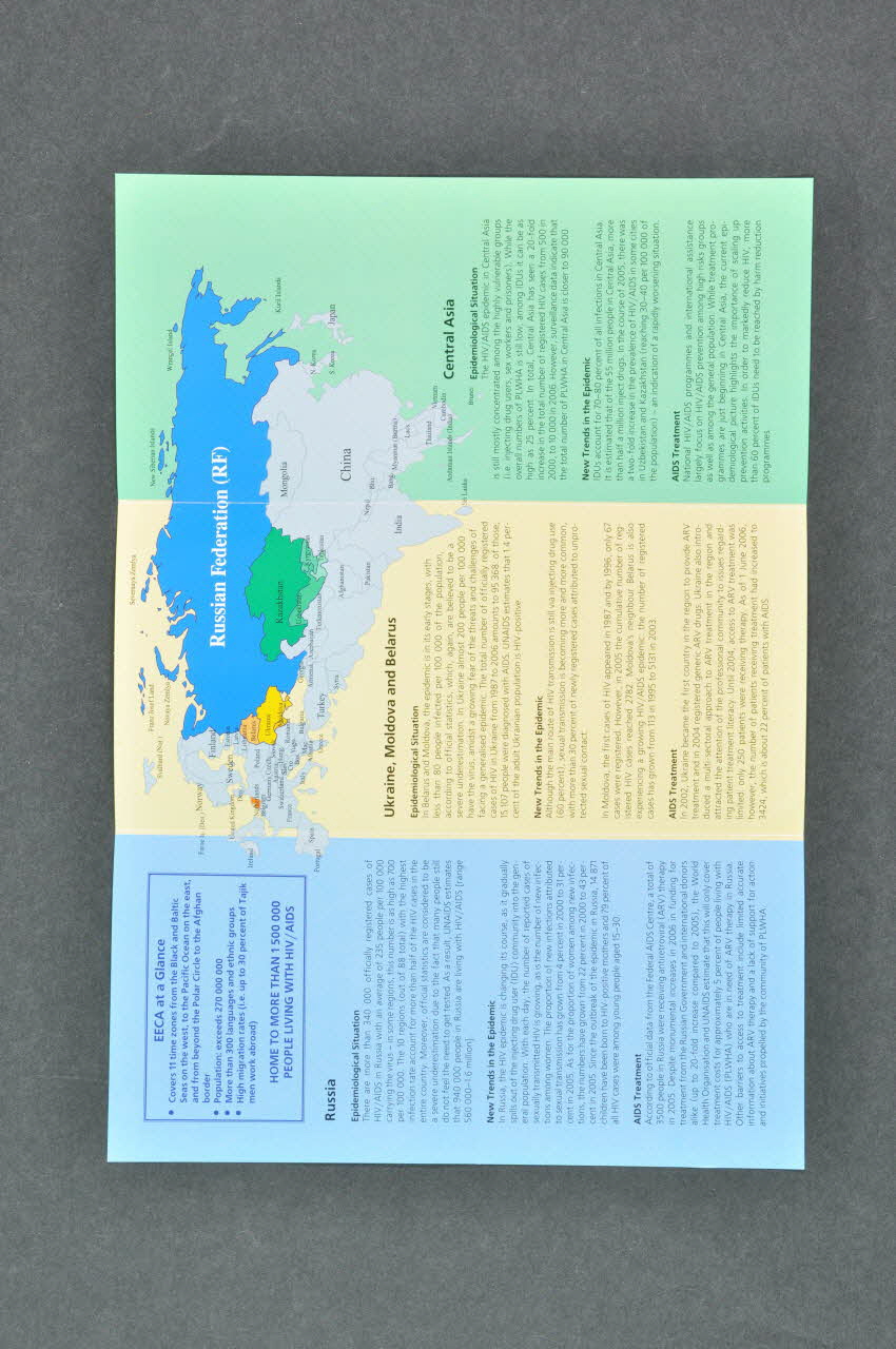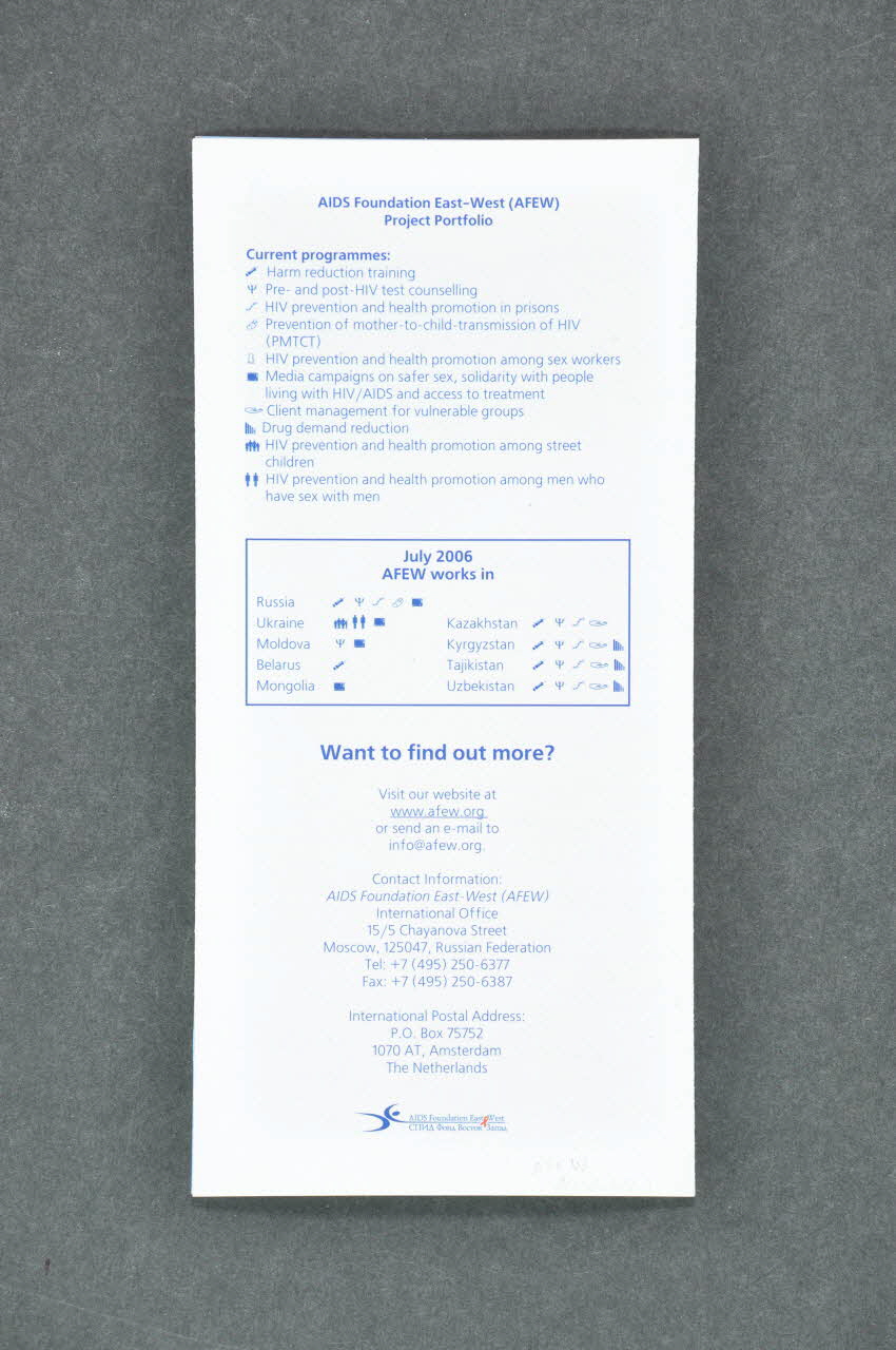 AIDS Foundation East-West (AFEW) // Project Portfolio (de l'arrière du dépliant, en bleu ; suivi de la légende des symboles), en hautTHE HIV / AIDS // EPIDEMICS // IN EASTERN // EUROPE // AND CENTRAL // ASIA (EECA) (partie supérieure de la couverture), en hautRussia // // Ukraine, Moldova and Belarus // // Central Asia (zones géographiques dont la situation est évoquée dans les pages intérieures), à l'intérieurAdresse