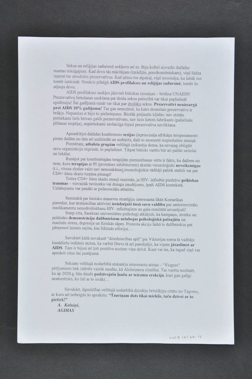 Il s'agit d'une feuille de papier machine au format A4 imprimée en noir sur ses deux faces. En haut on peut voir le titre en gras et en grandes capitales. Le texte est en letton, il y a treize paragraphes. A la fin le texte est signé.Inscriptions