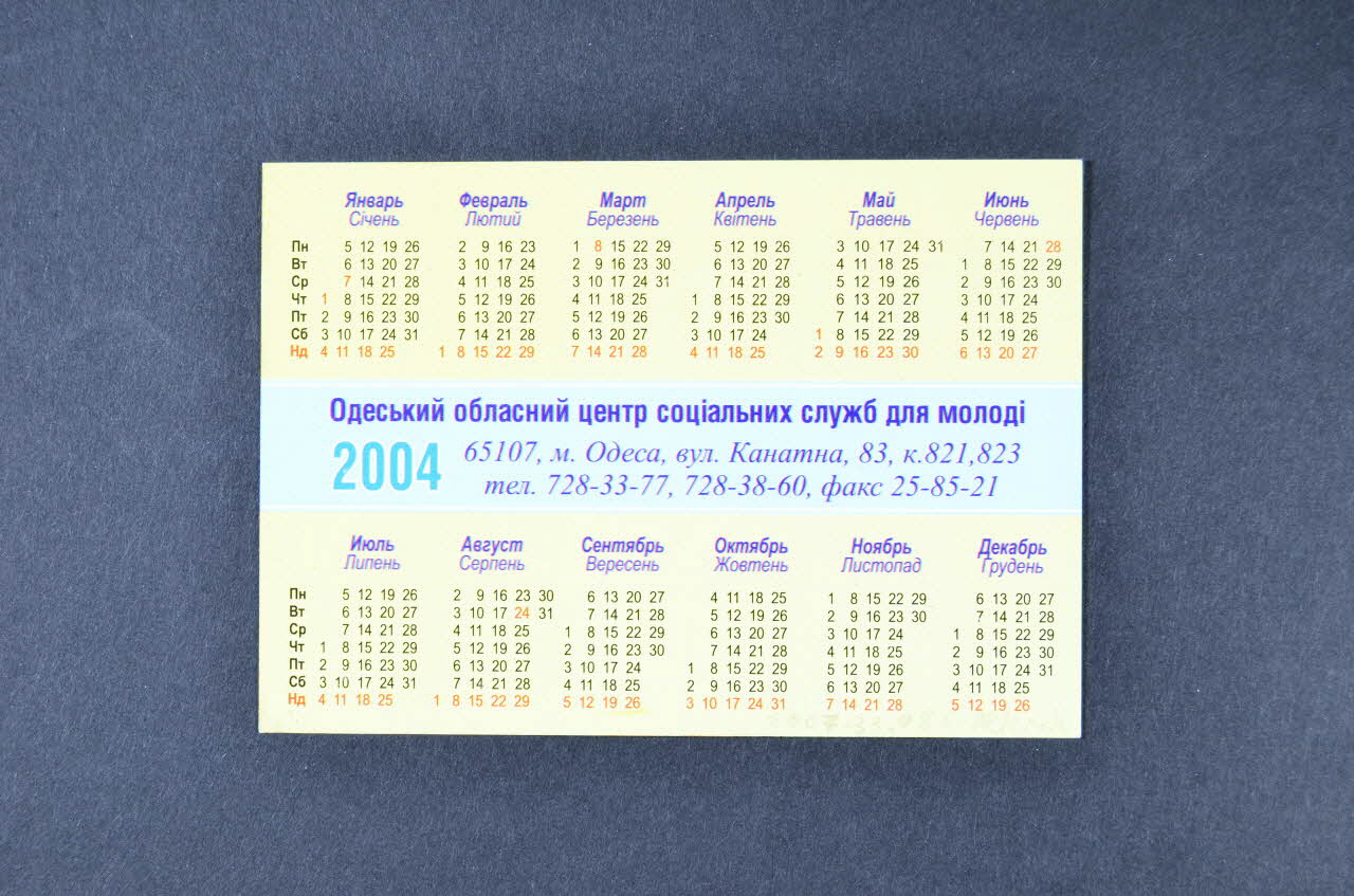 Le recto est illustré d'une photographie couleur : vus d'en haut, un homme nageant dans une piscine à gauche d'une femme étendue sur le bord de la piscine, tenant au dessus de sa tête un préservatif géant en guise de chapeau. Une large inscription noire en cyrillique figure au centre de l'image. Un petit logo constitué d'une main ouverte jaune et bleue occupe l'angle supérieur gauche. Le calendrier est imprimé au verso, en noir, rouge et violet sur fond jaune, avec un bandeau horizontal médian bleu portant des numéros.Décor