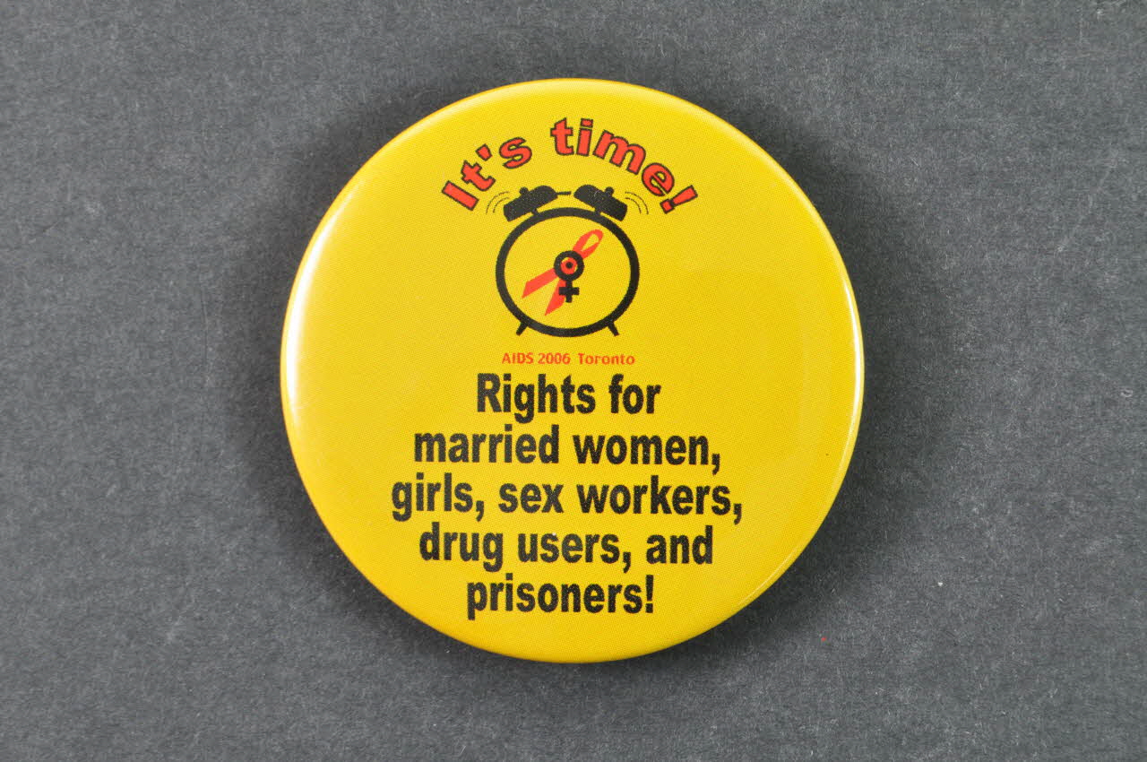 badge, "Rights for married women, girls, sex workers, drug users and prisoners" (Des droits pour les femmes mariées, les filles, les travailleuses du sexe, les usagers de drogues et les prisonniers !)