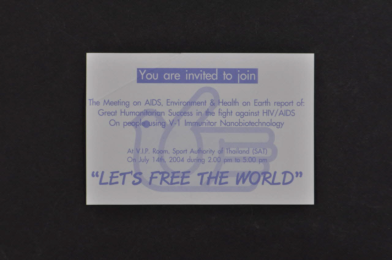 You are invited to join / The Meeting on AIDS, Environment & Health on Earth report of: / Great Humanitarian Success in the fight against HIV/AIDS / On people using V-1 Immunitor NanobiotechnologySlogan
