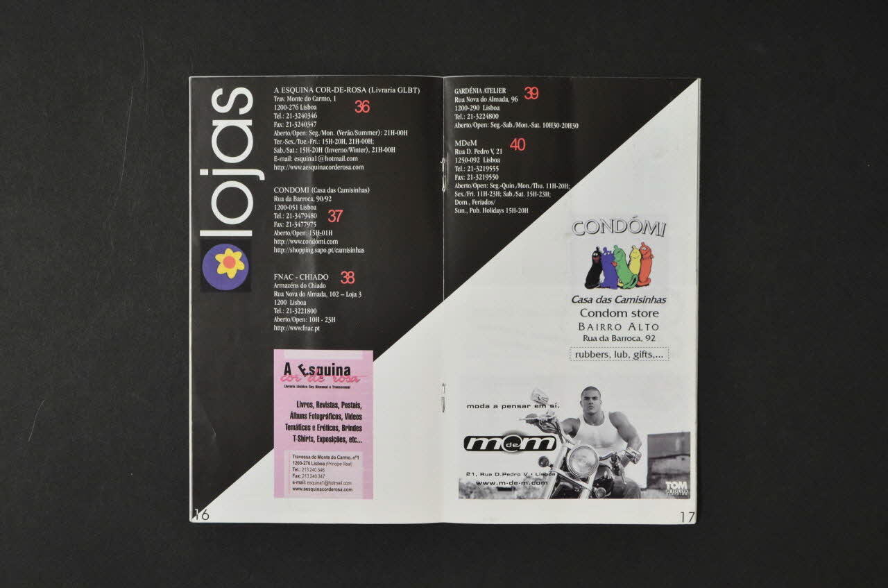 Couverture. Fond noir. Visages superposés bouche ouverte, flous sur fond bleu. En haut, en caractères blancs "Guia Gay & Lesbico de Lisboa 2001" (Guide gay et lesbien de Lisbonne 2001) et en bas traduction en anglais. Au dos, coordonnées de ILGA Portugal avec photo du local. A l'intérieur, 29 pages d'adresses et logos en portugais et en anglais: message de Joao Soares, maire de Lisbonne. Adresses de cafés, hotels, saunas, boutiques, restaurants, associations (gay et de lutte contre le sida). Conseils : faire le test gratuit : plus tôt on sait, meilleures sont les thérapies ; lubrifiants à base d'eau... Plan de la ville Plan du métro.
