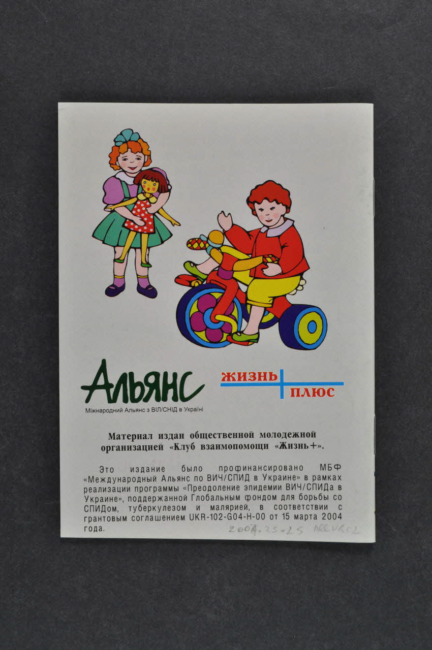 Sur la couverture arrière, sur un fond gris-vert se trouvent deux dessins : l'un d'une petite fille avec une poupée et l'autre d'un petit garçon sur un vélo.