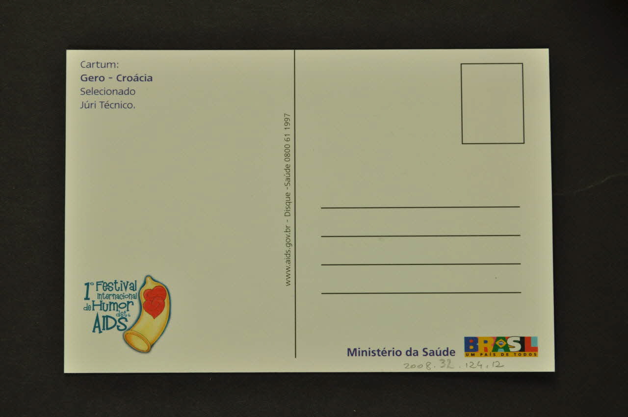Ministério da Saúde BRASIL UM PAIS DE TODOS (en bas à droite), verso1° Festival // internacional // de Humor // dst & // AIDS (en bas à gauche, avec un dessin de deux coeurs dans un préservatif.), versoAdresse, date
