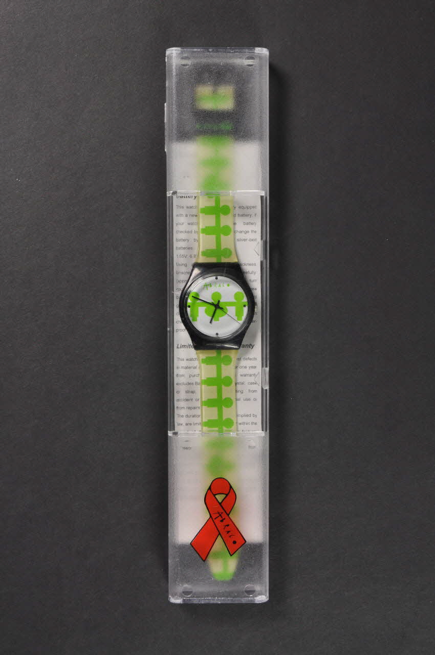 Montre bracelet en plastique et métal. Le boîtier est en plastique noir. Le cadran est recouvert d'un autocollant à fond blanc avec trois silhouettes humaines vertes imprimées. Les aiguilles sont noires. Pas de chiffre imprimé, juste le nom de l'association en vert. Le bracelet est en plastique transparent. Un autocollant à fond jaune est parsemé de silhouettes humaines vertes qui se tiennent par la main. La boucle est en plastique noir. Un anneau en plastique noir est enfilé sur le bracelet avec le nom de l'association marqué en vert dessus. Une pile circulaire est enfoncée au revers du cadran.Décor