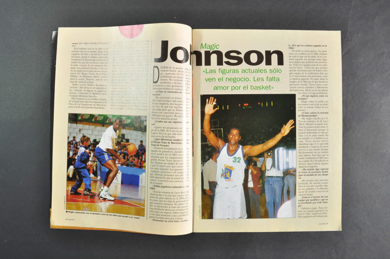 A'intérieur, les pages 6 à 11 sont consacrées à Magic Johnson, avec des photographies couleur. Titre : "Fascinant comme personne et comme joueur à Badalona. Anatomie d'une étoile". En italiques :"En le voyant jouer on a peine à croire que cet homme est porteur du virus de sida. Il a disputé 12 rencontres en 20 jours et à Badalona il a vécu 48 heures de fatigue continue. En le voyant sourire et en le voyant vivre, on est sûr que c'est un homme inusable, un mythe, un héros qui dit à chaque geste, à chaque sourire ; je peux vivre avec la pire plaie de l'humanité et en plus être heureux. Erving Magic Johnson, tout au long de ces deux années depuis qu'il a déciuvert au monde qu'il était porteur des anticorps du virus du Sida, a fait plus pour les malades et pour sa propre maladie que tous les efforts pour la combattre."