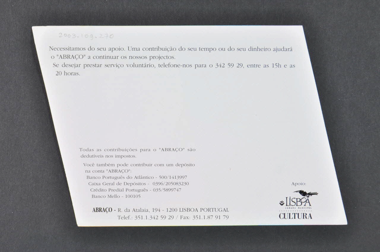 R. da Atalaia, 194 - 1200 LISBOA PORTUGAL (Imprimé en noir sur blanc, dans le bas), versoTexte