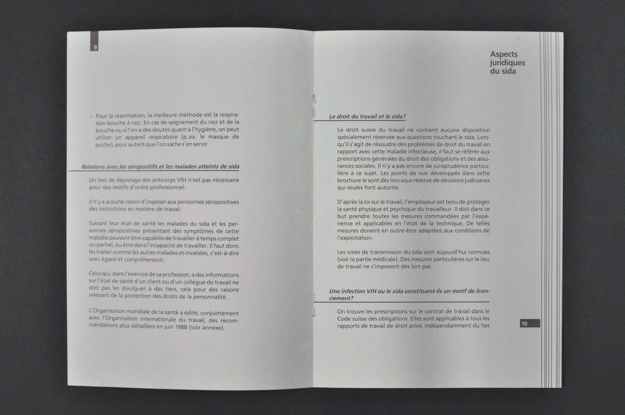 Sommaire // 1. Introduction // Aspects médicaux du sida // 2. Connaissances élémentaires sur le sida : qu'est-ce que le sida ? / comment se propage le VIH ? // 3. Qu'est-ce qui ne contamine pas ? // 4. Le virus peut-il être transmis au travail ? // 5. Quelles règles doit-on observer dans les différentes catégories de profession ? // 6. Que faut-il faire en cas de voyage à l'étranger ? // 7. Premiers secours au poste de travail // 8. Quelles mesures de précaution supplémentaires doit-on observer dans le domaine des premiers secours ? // 9. Relations avec les séropositifs et les malades atteints de sida // Aspects juridiques du sida // 10. Le droit du travail et le sida // 11. Une infection VIH ou le sida constituent-ils un motif de licenciement ? // 12. Un employeur peut-il communiquer des informations en sa possession sur la santé de ses travailleurs ? // 13. L'employeur répond-il du fait qu'un travailleur a été infecté à son travail par le VIH ? // 14. Un employeur peut-il exiger de ses employés qu'ils se soumettent à un test de dépistage des anticorps VIH ? // 15. Un travailleur doit-il annoncer à son employeur une infection VIH ? // 16. Les caisses de retraite ont-elles le droit de refuser l'admission de personnes séropositives ? // 17. Quelles sont les prestations de l'assurance-chômage à une personne séropositive ou atteinte du sida ? // 18. Une infection VIH peut-elle constituer un accident professionnel ou une aladie professionnelle?Concernant la date