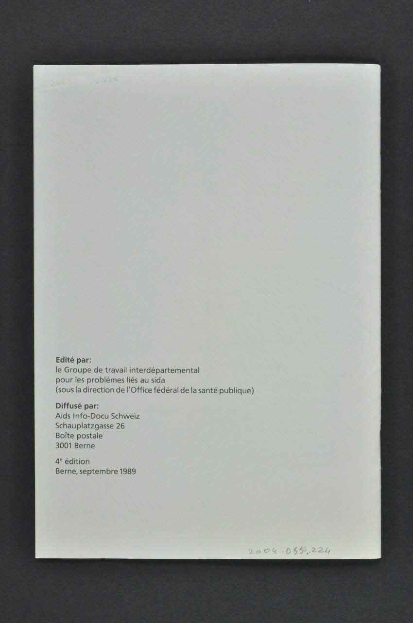 Diffusé par : // Aids Info-Docu Schweiz // Schauplatzgasse 26 // Boite postale // 3001 Berne (deuxième de couverture, sur deux pages), versoConcernant le lieu d'édition