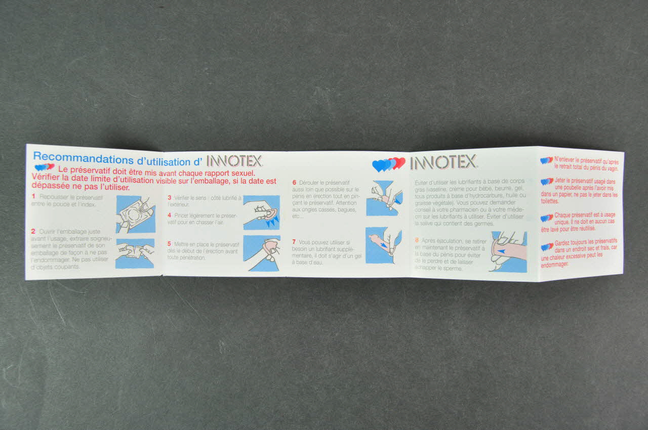 Recommandations d'utilisation d'Innotex // Le préservatif doit être mis avant chaque rapport sexuel. Vérifier la date limite d'utilisation visible sur l'emballage, si la date est dépassée ne pas l'utiliser. // [...] // // - N'enlever le préservatif qu'après le retrait total du pénis du vagin. // - Jeter le préservatif usagé dans une poubelle après l'avoir mis dans un papier, ne pas le jeter dans les toilettes. // - Chaque préservatif est à usage unique. Il ne doit en aucun cas être lavé pour être réutilisé. // - Gardez toujours les préservatifs dans un endroit sec et frais, car une chaleur excessive peut les endommager., à l'intérieurDécor