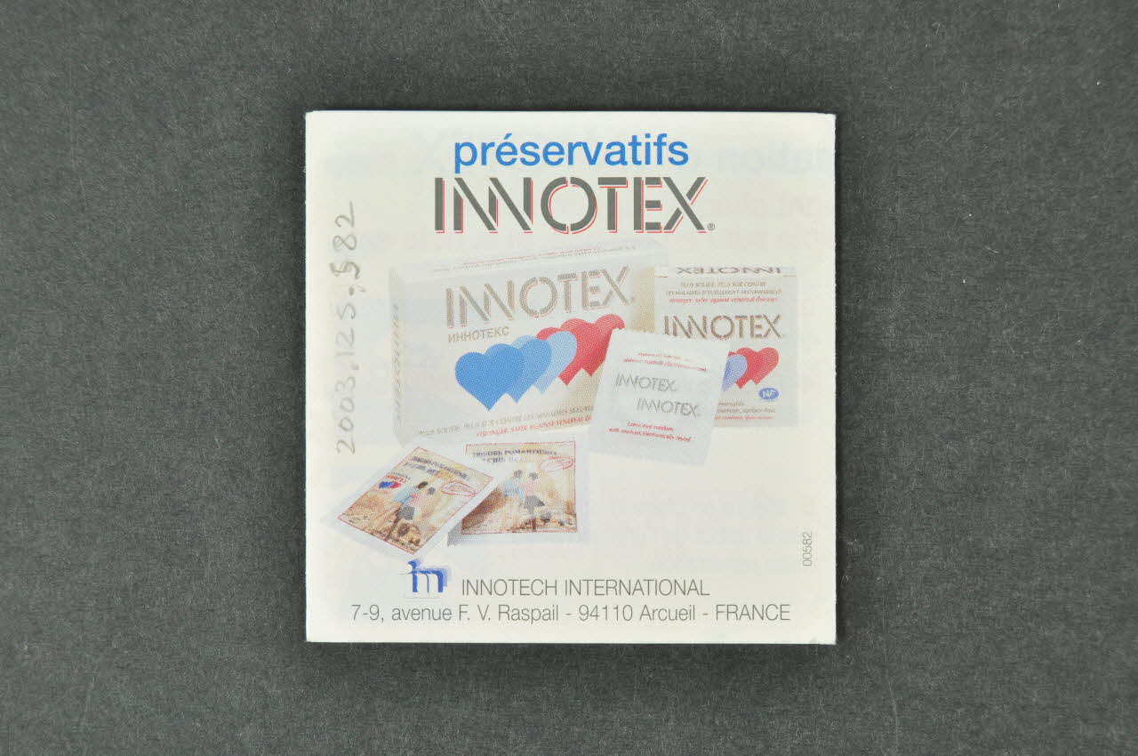 Une protection efficace et sûre // Expérimenté par l'Institut A. Fournier de Paris (Centre OMS des maladies sexuellement transmissibles). Au cours de cette étude, le préservatif Innotex a été analysé en présence de virus, dont certains de taille inférieure à celle du SIDA. Les résultats ont montré qu'aucun virus n'a traversé le préservatif. Une expérimentation de haute technicité, effectuée dans le Laboratoire d'Oncologie Virale de l'Institut Pasteur de Paris et conduite par le Professeur Montagnier, a confirmé que le préservatif Innotex empêche le passage du virus du SIDA., versoMode d'emploi