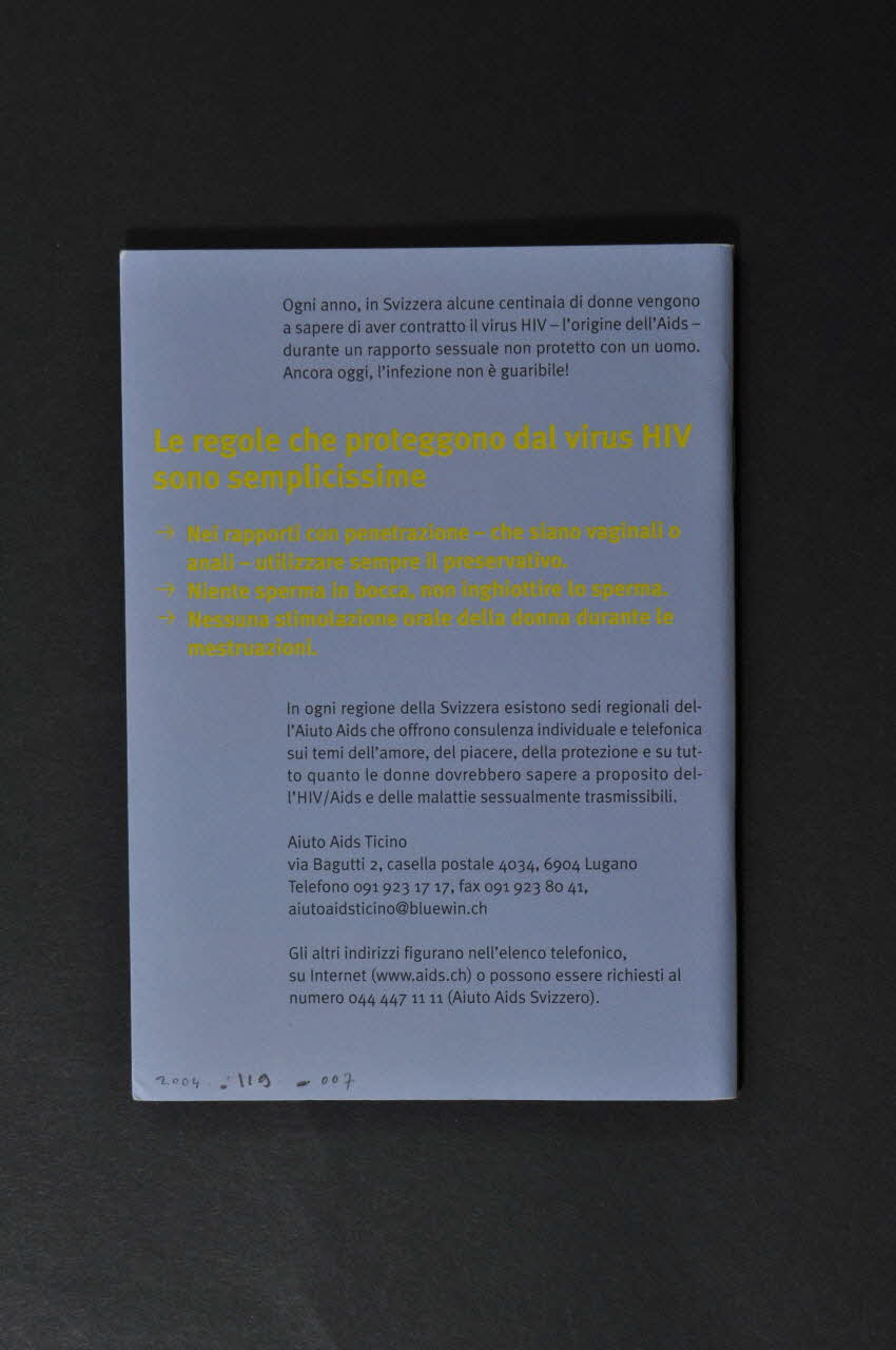 BROCHURE, "Passione, piacere & protezione. Tutto quello che le donne dovrebbero sapere sull'HIV/Aids e sulle altre malattie sessualmente trasmissibili" (Amour, plaisir et protection. Ce que les femmes doivent savoir sur le VIH/sida et sur les maladies sexuellement transmissibles).