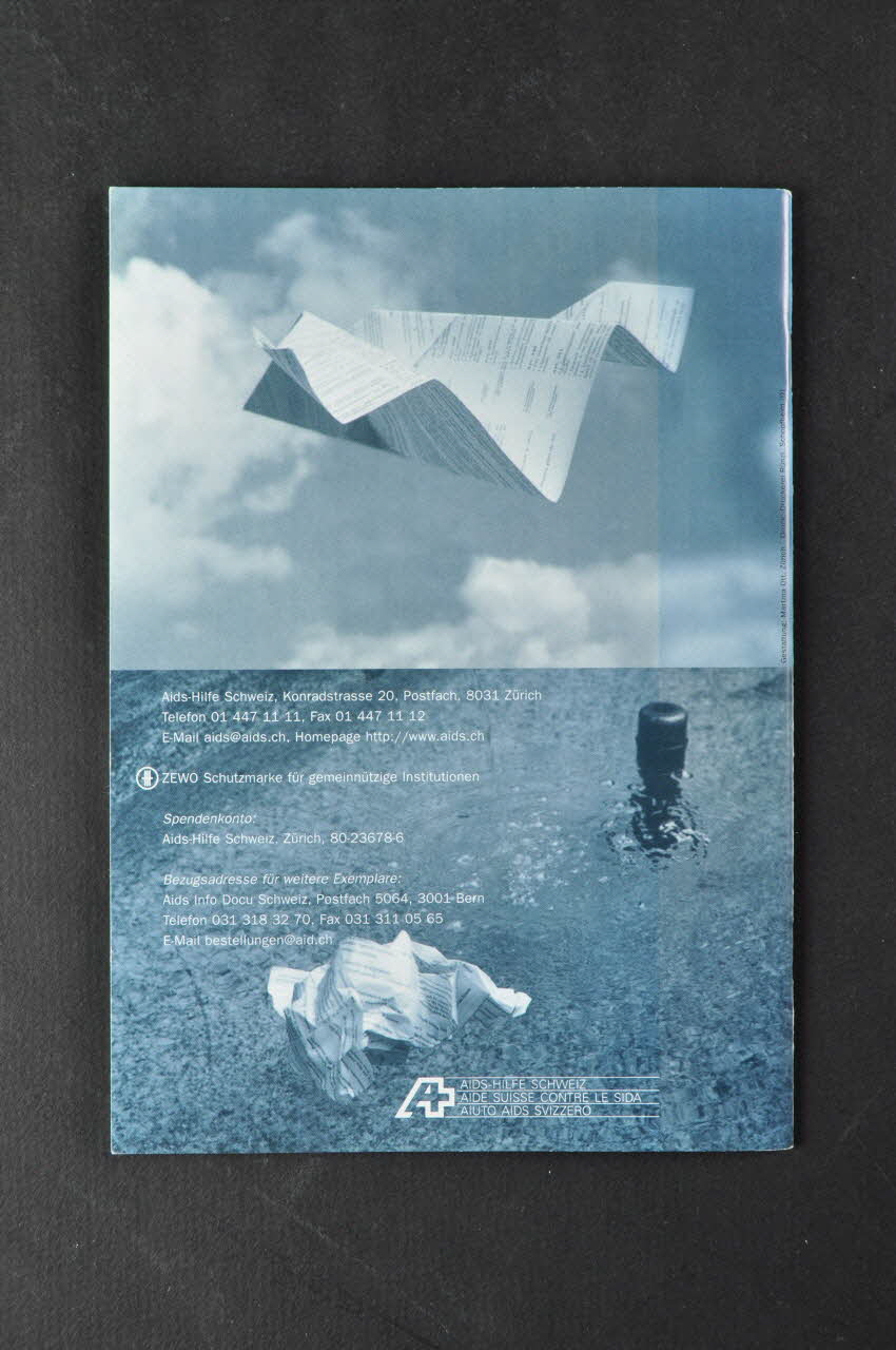 La quatrième de couverture est également divisé en deux parties. En haut, photo en gris d'un ciel avec nuages dans lequel vole l'avion de papier. En bas, photo en gris d'un papier administratif froissé sur le sol. Sont imprimés en caractères blancs, les coordonnées de l'association. Les pages intérieures présentent un fond blanc, impression en noir. En marge, des remarques, des exemples, des encarts et des points importants en bleu. Huit photos noir et blanc en bas de page gauche présentant avec humour des formulaires en cornet, avion, piétinés, en éventail, bourrant des chaussures, lavant des vitres, jouet d'enfant, petit bateau.Inscriptions