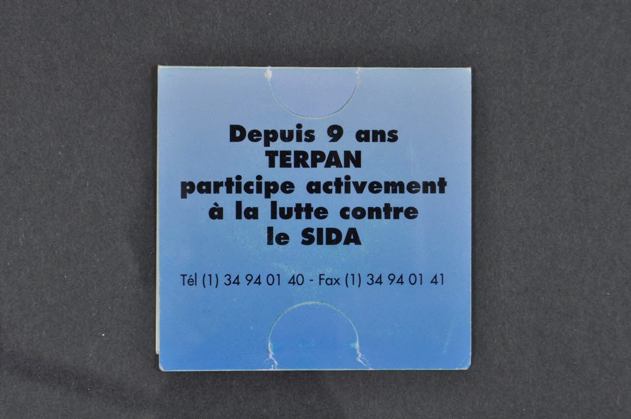 Depuis 9 ans // TERPAN // participe activement // à la lutte contre // le SIDA // [...] (Au verso. En lettres noires sur fond bleu.), sur la couvertureDécor