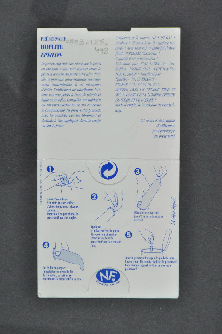 PRESERVATIF // HOPLITE // EPSILON // Le préservatif est placé sur le pénis // [...] // // STOCKER DANS UN ENDROIT FRAIS ET SEC [...] (En lettres bleues sur fond blanc, sur le rabat supérieur.), à l'intérieurLégende, slogan, marque