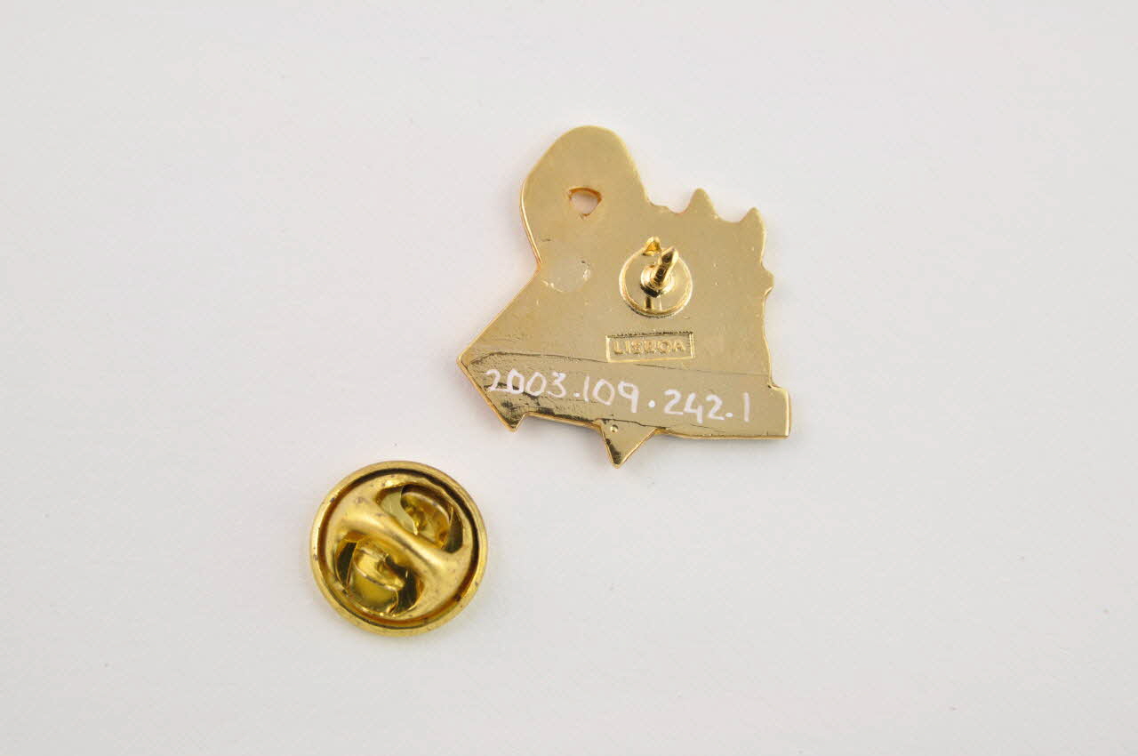 Pin's en métal doré, prenant la forme d'un ruban rouge. Sur le pan gauche figure un château gris et bleu, aux murs crénelés, ceint de doré. Le pan droit présente le nom de l'association en lettres dorées.Décor