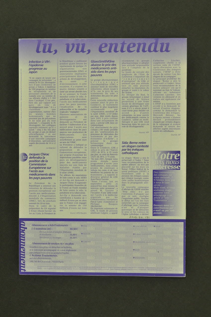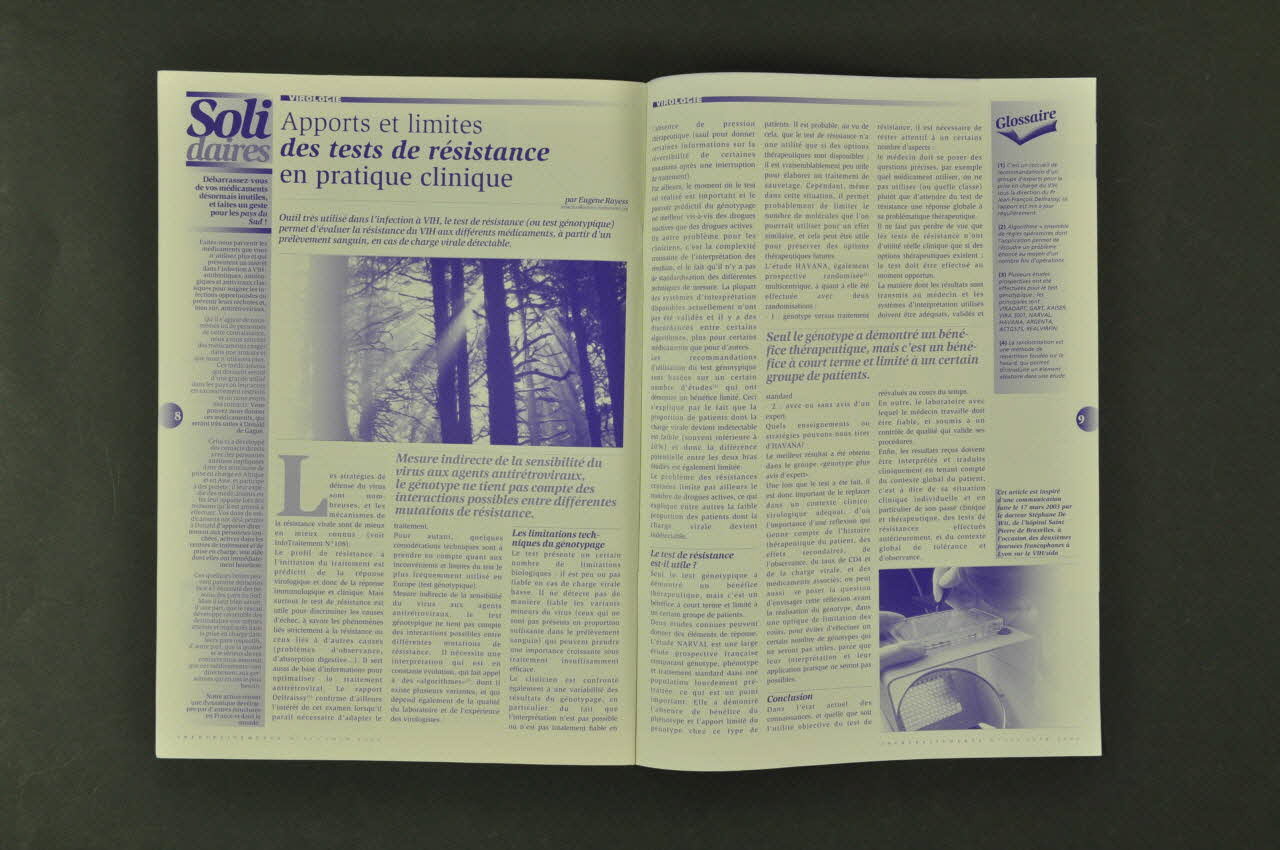 - exclusion, préservatif, savoir du malade, patchwork des noms, accès aux traitements, religion, Solidays, G8, Europe, censure, résistance au traitement, observance, association, épidémiologie, femme, sport, laboratoire pharmaceutique, test génotypique, relation médecin malade, mobilisation, Glaxo, Guyane, thérapeutique
