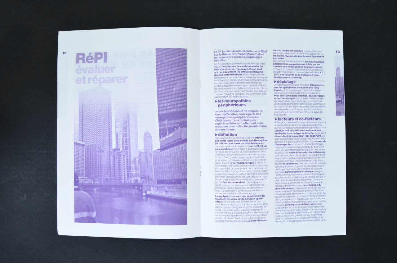 Il s'agit d'un bulletin d'information composé de vingt-trois pages imprimées en violet sur du papier blanc et reliées entre elles par deux agrafes. Le nom, le numéro, la date de publication de la revue ainsi que son sommaire sont visibles sur le bord latéral gauche de la couverture. A l'intérieur, outre la grande quantité de texte on compte six photographies. La quatrième de couverture fait office de bulletin de souscription en faveur de l'association Act Up-Paris.Inscriptions