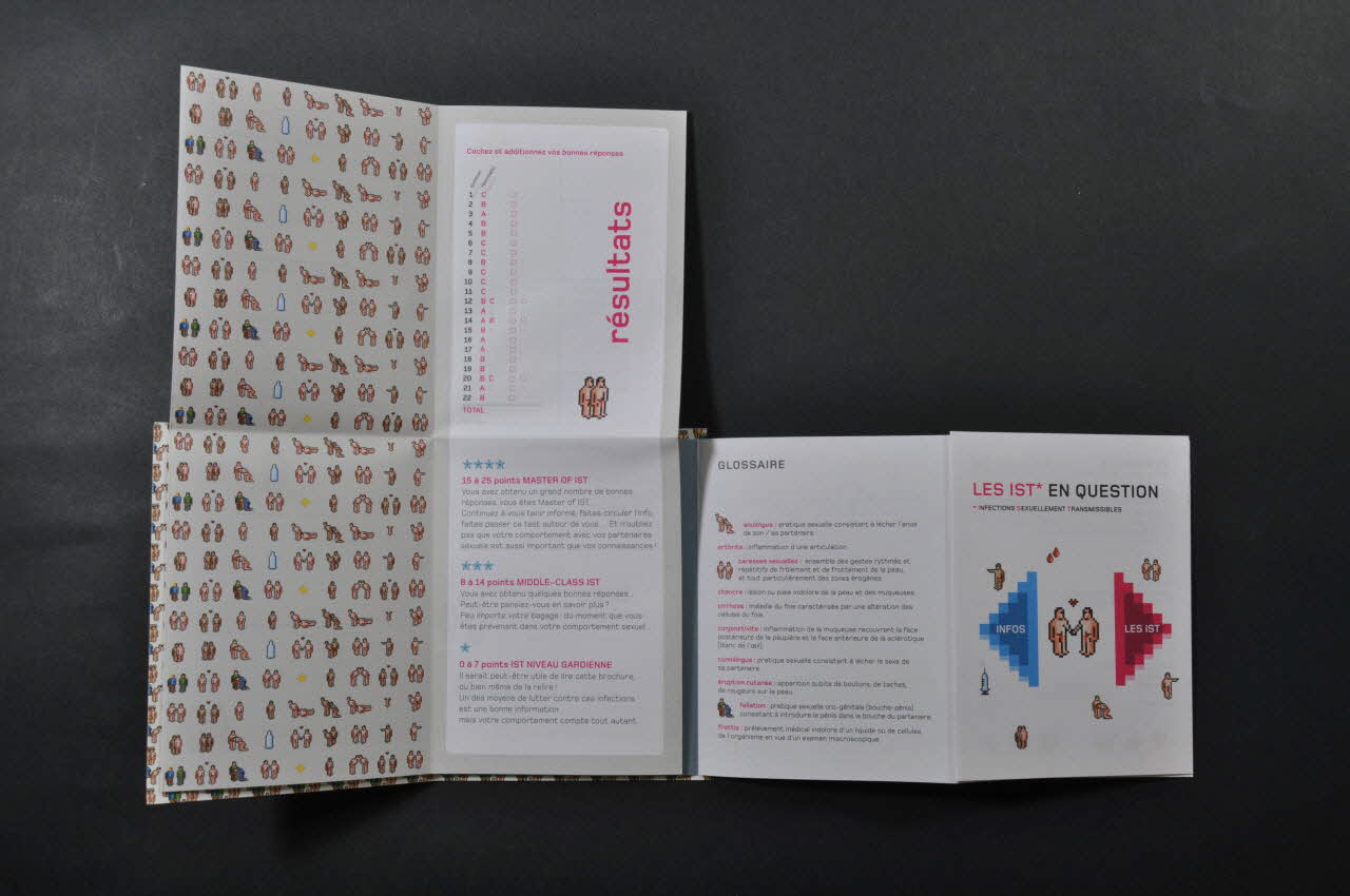 A l'intérieur, le dépliant de gauche est plié en 2 x 4. Il s'agit d'un quiz en relation directe avec le dépliant de droite. Sur le premier volet est imprimé du texte en rose qui présente le document (à qui il s'adresse, pour quelles raisons...). L'intérieur comprend une série de vingt-deux questions sous forme de QCM. Chacune d'elles est placée dans un encadré noir. De petits dessins sont imprimés çà et là et présentent un couple d'hommes nus. Au dos se trouvent les résultats.