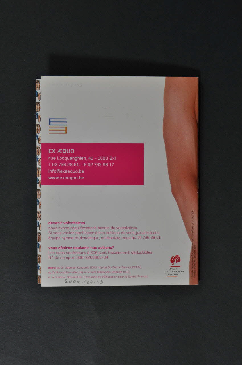 La couverture présente, sur un fond blanc, un homme nu cachant son sexe. On ne voit ni sa tête, ni ses jambes. Le titre est présent au centre, dans un encadré rose. La tranche reprend le titre en blanc. Sur le verso sont imprimés des coordonnées, deux logos et du texte en petits caractères roses. Il s'agit d'un appel aux dons et au volontariat.