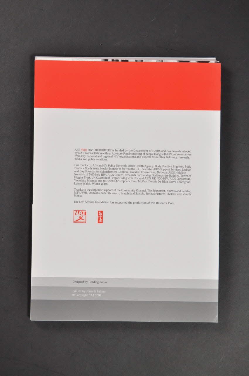 www. areyouhivprejudiced.org (En bas sur le bandeau gris de la pochette), sur la couvertureThe National AIDS Trust (NAT) // New City Cloisters // 196 Old Street // London EC1V 9FR // [...] (de la pochette, en bas du volet gauche // // L'adresse se retrouve aussi sur l'enveloppe marron (.20)), à l'intérieurTitre