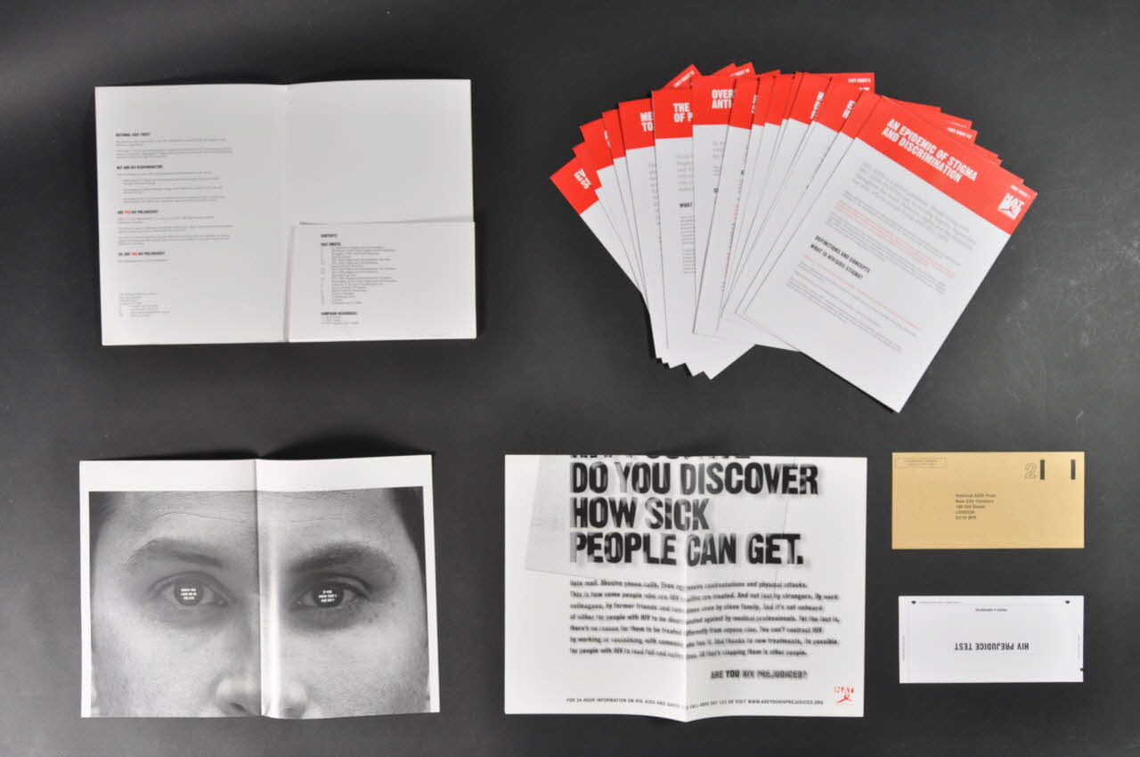 CONTENTS // // FACT SHEETS: // 1. An Epidemic of Stigma and Discrimination // 2. The Impact of HIV/AIDS Stigma and Discrimination // 3. Examples of HIV/AIDS Discrimination // 4. Sepcific Groups // 4.1. HIV/AIDS Stigma and Discrimination : Gay Men // 4.2. HIV/AIDS Stigma and Discrimination : // Racial and Ethnic Minorities // 4.3. HIV/AIDS Stigma and Discrimination : Sex Workers // 4.4. HIV/AIDS Stigma and Discrimination : // Injecting Drug Users // 4.5. HIV/AIDS Stigma and Discrimination : Prisoners // 5. Responding to HIV/AIDS Stigma and Discrimination // 6. Overview of UK ANti-Discrimnation Law // 7. The Psychology of Prejudice // 8. Media Guide to Terminology // 9. Activity Alphabet // 10. A Workshop Guide // 11. Contacts // 12. Evaluation Survey 2003 // // CAMPAIGN RESOURCES // 1 x 'Eyes' Poster // 1 x 'Sick' Poster // 1 x 'HIV Prejudice Test' Leaflet (Liste des documents contenus dans la pochette sur le rabat droit de celle-ci, en noir.), à l'intérieurAdresse