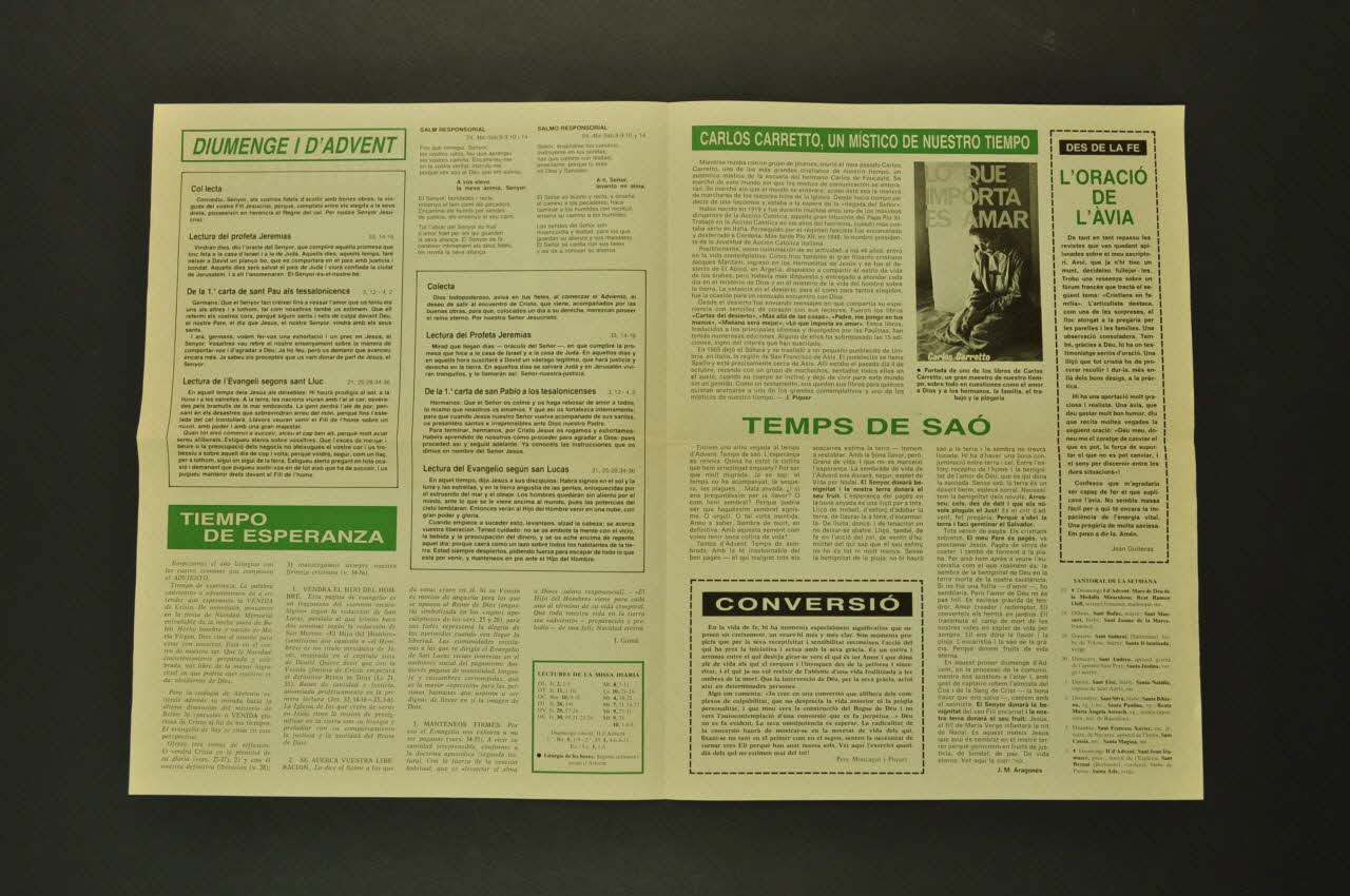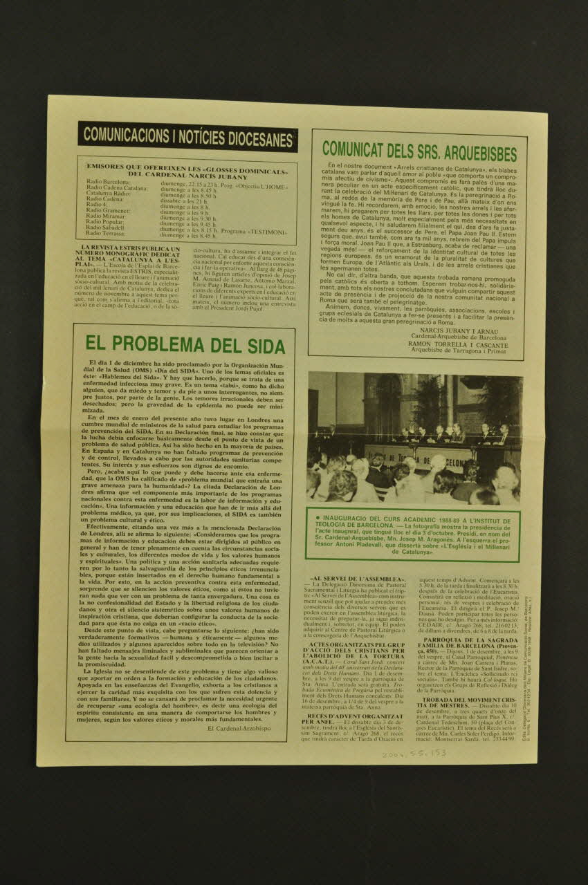 Full Dominical (de la première page, dans un cadre vert.), en hautMES // COORDINACIO // ENTRE // ELS JOVE // CRISTIANS // // EL PROBLEMA DE LA SIDA (titre des deux principaux articles de la première page)Date
