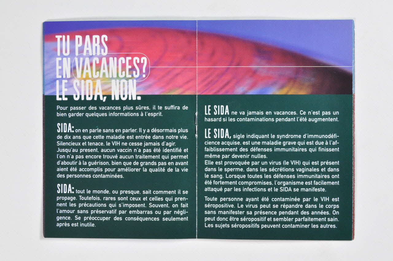 Contro l'AIDS hai un'arma intelligente : la tua testa // (Contre le sida, tu as une arme intelligente : ta tête) (sur la couverture)TU PARS EN VACANCES? LE SIDA NON. / SIDA / LA CONTAMINATION. SI TU SAIS COMMENT LE VIRUS ATTAQUES,TU PEUX LE PREVENIR. / LE TEST VIH : CONNAITRE POUR COMBATTRE. / AVEC LE PRESERVATIF, L'AMOUR NE PERD RIEN ET LA SANTE A TOUT A Y GAGLER. / SI TU PARS EN VACANCES, GARDE LES PIEDS BIEN SUR TERRE ! / ALCOOLET DROGUE : LES MEILLEURS ALLIES DU SIDA. / PIERCING, TATOUAGES, SIDA. DES CHOSES QUI LAISSENT UNE TRACE. / COMMENT UTILISE-T-ON LE PRESERVATIF (titres des règles en plusieurs langues)Décor