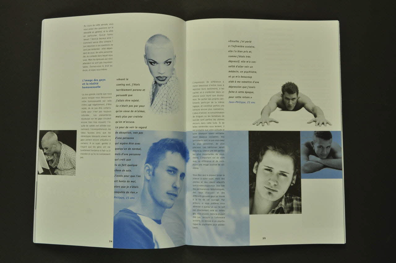 La première de couverture est composée d'un montage photographique dans les tons bleus, sur lequel sont insérées des inscriptions. L'image est celle d'un portrait de visage de face divisé en deux : la moitié droite est celle d'une femme, celle de gauche un homme. L'arrière est blanc, avec des inscriptions en bas, et la photographie d'une main dans des tons bleus sur le bord droit. L'intérieur de la brochure contient des textes illustrés de photographies de femmes, d'hommes, de couples et de groupes dans diverses postures et situations. Les images sont en noir et blanc ou dans des tons de bleu.Inscriptions